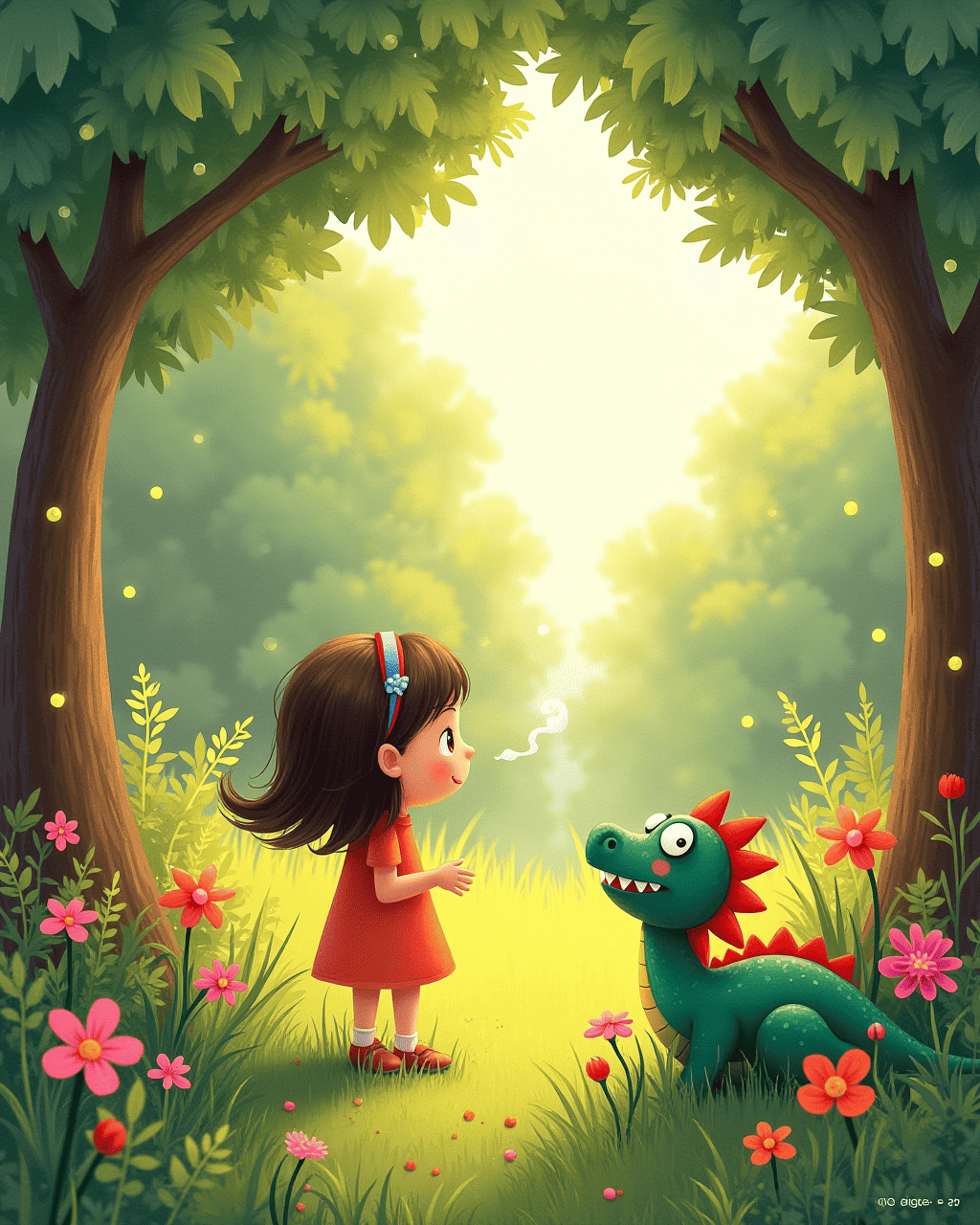 Lily woke up to sunshine spilling into her room. She heard her crayons whisper, inviting her to a secret world. She followed the bright blue trail that led her to a doorway made of paper and glue. Beyond the doorway, a forest of paper mâché trees welcomed her with rustling leaves. Lily laughed as a green dragon made of construction paper breathed gentle smoke.