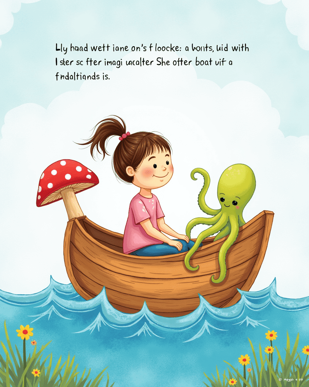 She found a wooden boat shaped like a mushroom. Lily perched on it and imagined she was sailing the sea of her imagination. The boat rocked with waves of colored yarn. A friendly octopus of felt waved a tentacle to greet her. Lily felt her thoughts sprout like tiny fireworks of ideas.