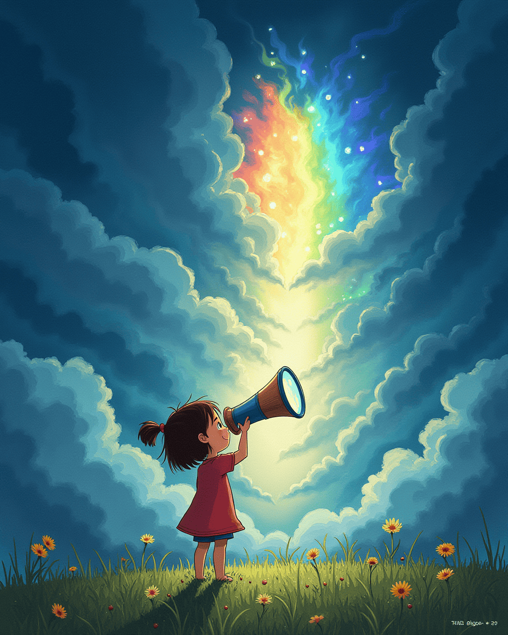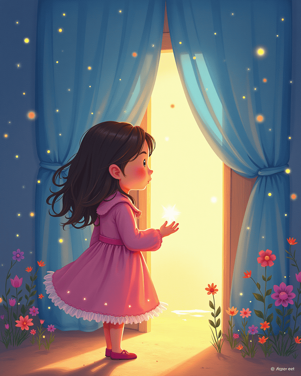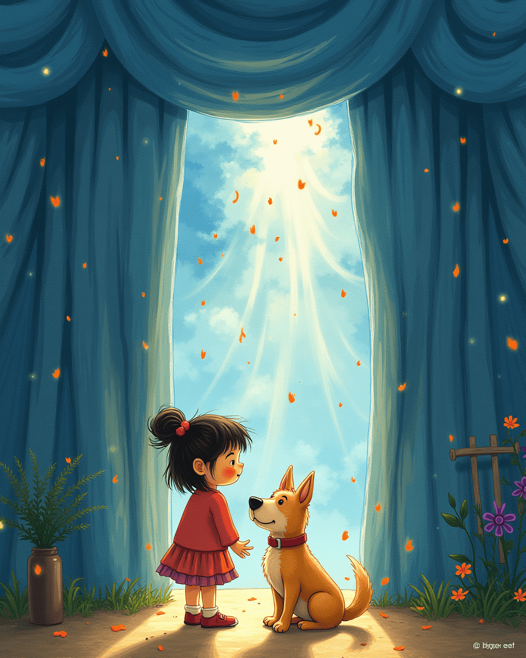 Suddenly, her imagination leaked like a small rain across the room. Her drawings, ideas, and songs slipped through the curtains and into the real world. Lily watched them float, twirl, and settle onto her neighbor’s doorstep. Her neighbor's dog bowed politely and bowed to Lily. She felt grateful and proud.