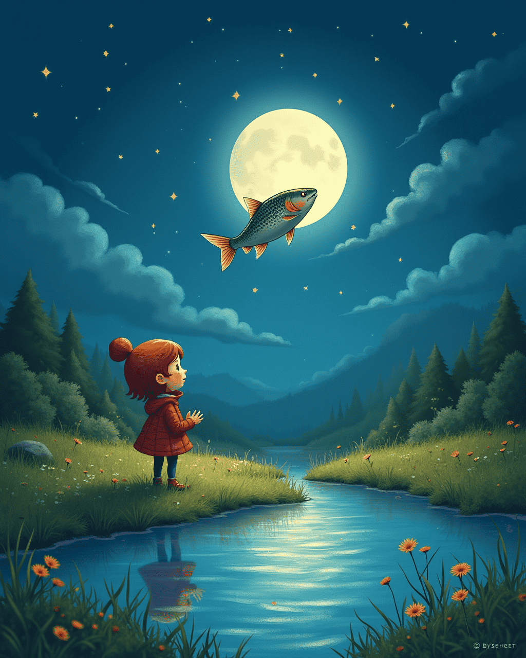 After the thrilling day, the fish returned to the pond and sang a gentle splash. The waters welcomed it back with calm whispers. Max asked the fish to fly again; the trout waved and smiled. At night, children lay on lily pads, listening to the water’s soft rhythm. Sophie remembered that magic can appear whenever we look.