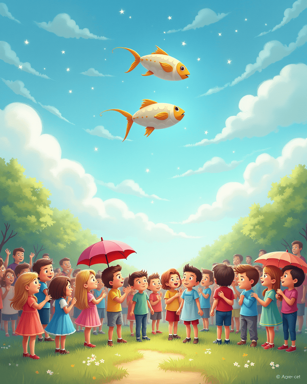 Children from the village lined up like a long ribbon to watch the sky show. Some held umbrellas, some wore hats, all laughing as the fish danced. Sophie whispered, “It’s like a fairytale.” Max nodded, feeling proud to witness such wonder. Their parents, amazed, filmed the event on their phones.