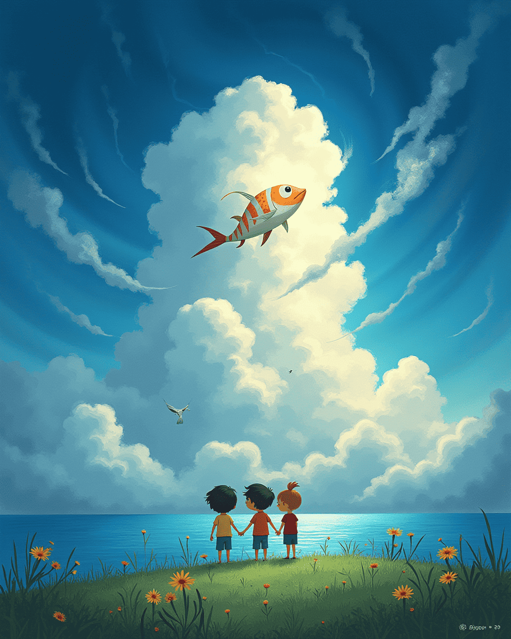 As the fish zipped through the clouds, the sky seemed to become a painting. Colors appeared brighter, turning the day into a bright canvas. Birds chirped, adding music to the scene. The fish’s path left a faint rainbow stripe across the sky. Everyone felt joyous, as if they could reach for the horizon.