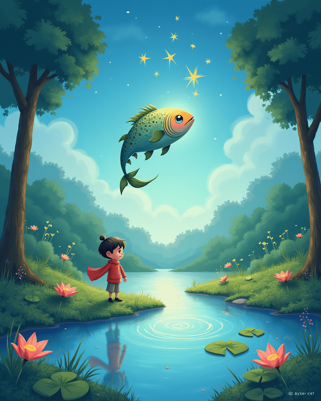 It was an ordinary day at Willowbrook Pond, until the sky turned a bright shade of blue and something extraordinary happened. Little Sophie and her best friend Max were watching the fish swim when a gust of wind lifted a trout to the air. The fish flapped its fins like wings, soaring higher and higher. Everyone gasped, cheering as the trout glided over the trees. That moment will always be remembered as the day the fish flew.