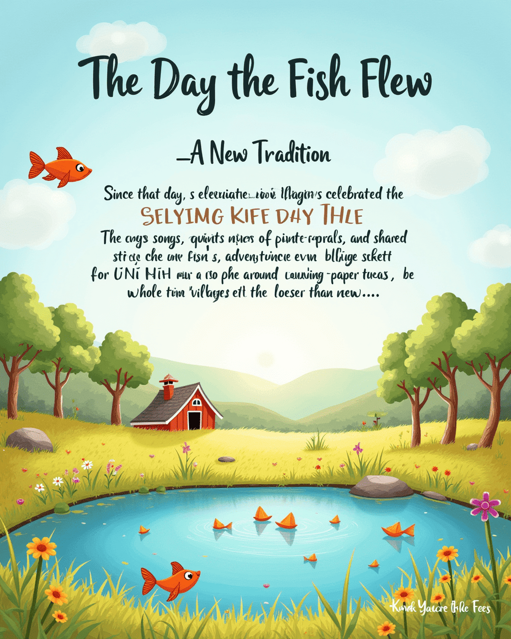 Since that day, the villagers celebrated the “Flying Fish Day” every spring. They sang songs, painted murals, and shared stories of the astonishing event. Max and Sophie helped sketch the fish’s adventures. The children ran around laughing, waving paper boats. By the time the sun set, the whole village felt closer than ever.