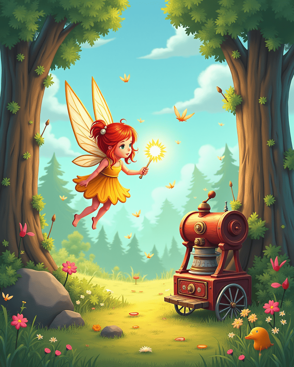 A shy fairy named Lila fluttered into the workshop on a breezy afternoon. She whispered a secret wish: bring joy to all the forest creatures. Mr. Tinker added her wish to the machine’s mix, which glowed brighter than the morning sun. As the machine chirped, Lila’s wings sparkled, ready to guide the new story into the world. The children gasped in delight, watching the fairy’s magic unfold.
