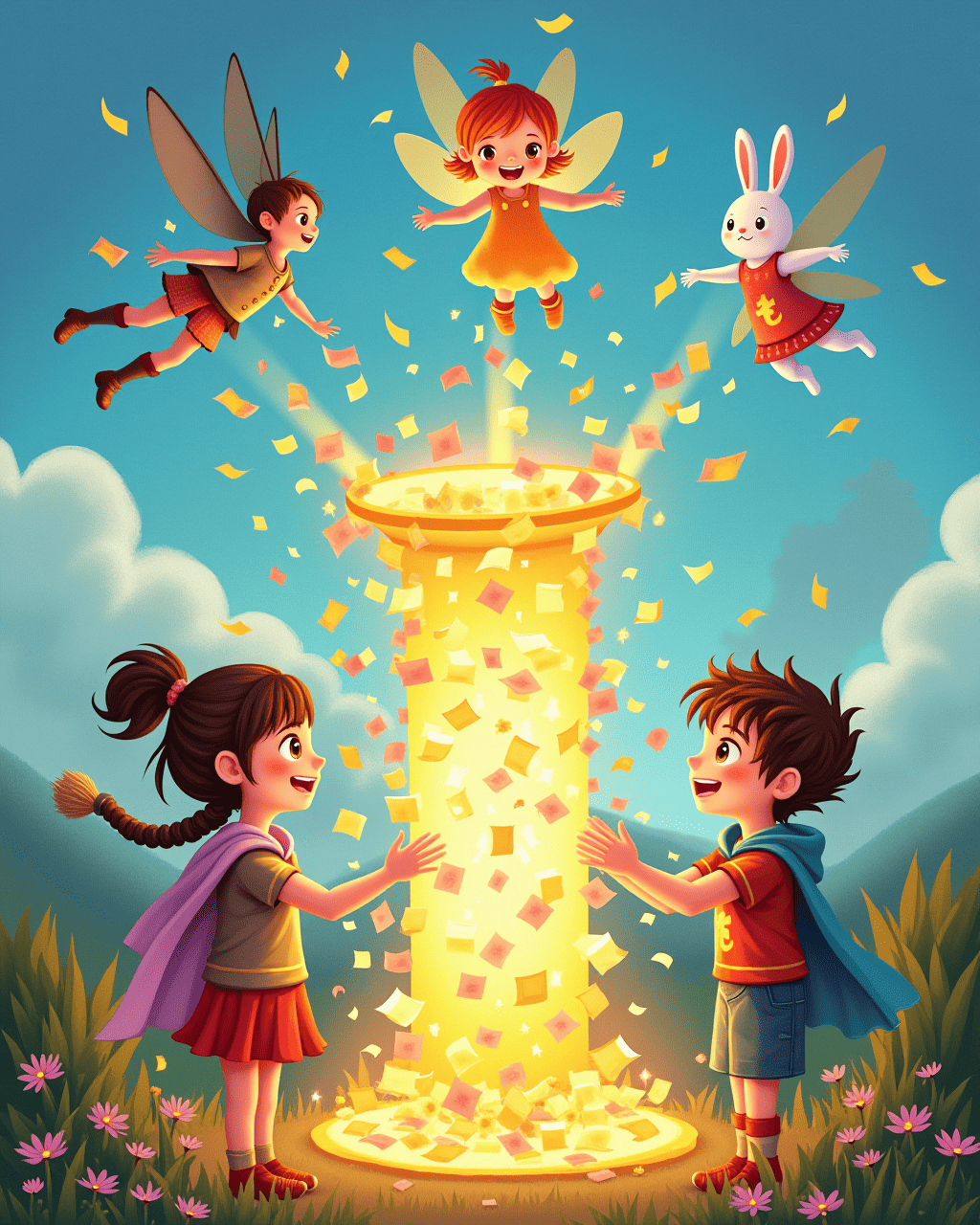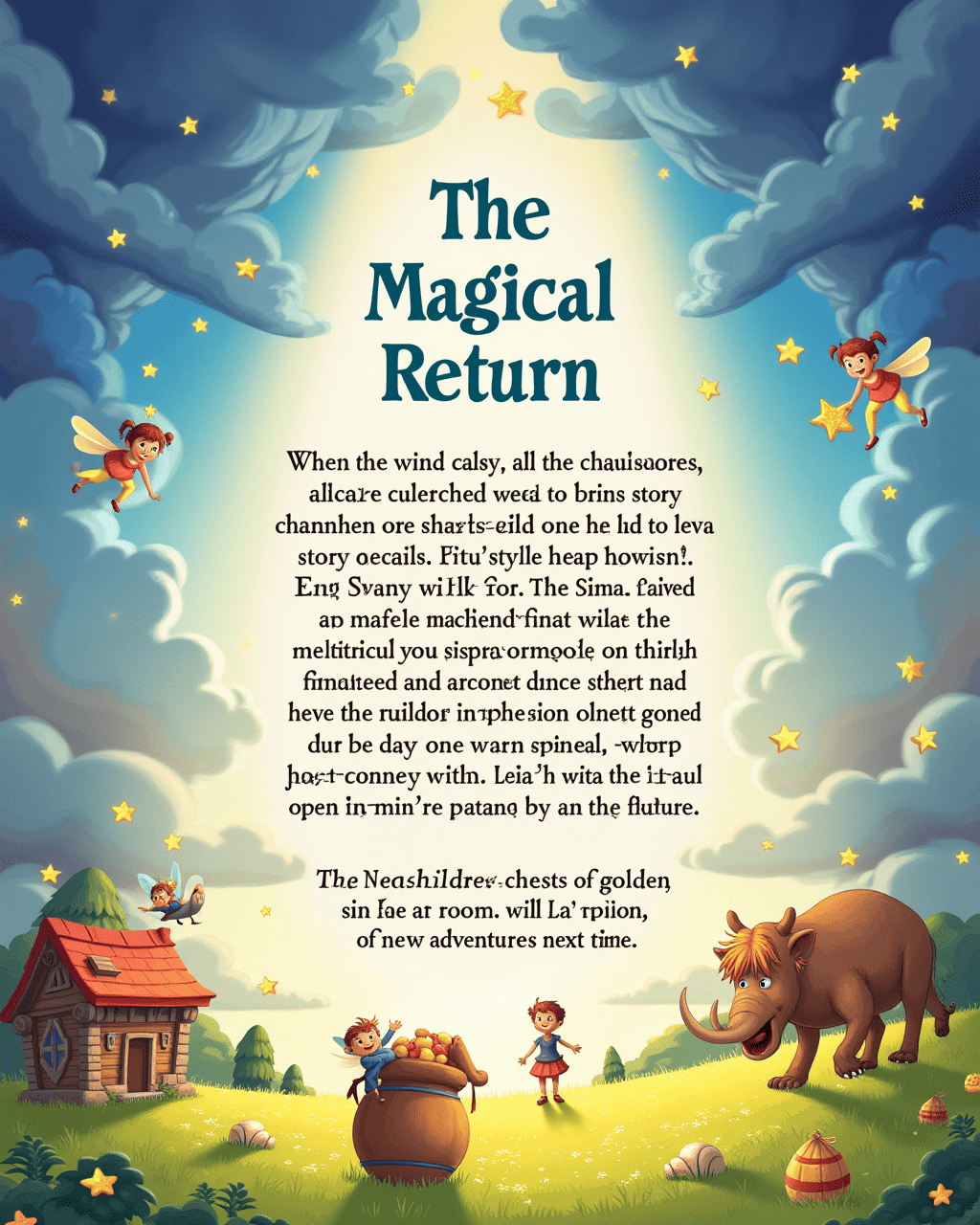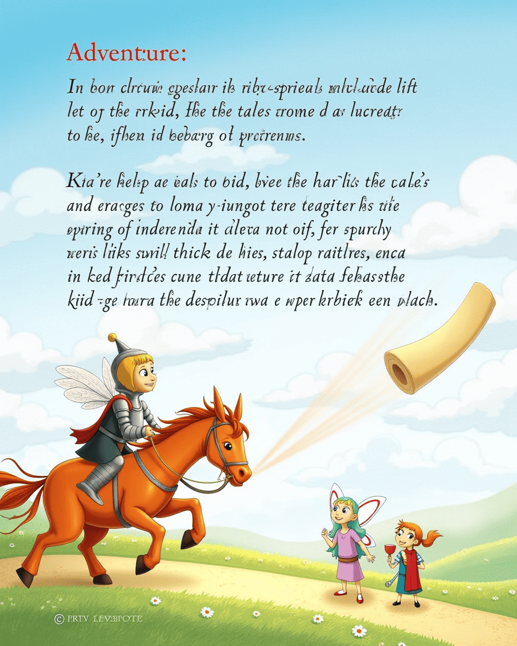 Suddenly, a mischievous wind pushed the scroll into the sky. The tale’s characters were lifted into a dream‑like swirl of clouds. The children had to help the knight, fairy, and rabbit navigate the swirling skies. Together, they faced friendly dragons and solved riddles that led to hidden clues. The adventure was filled with laughter and brave heartbeats.