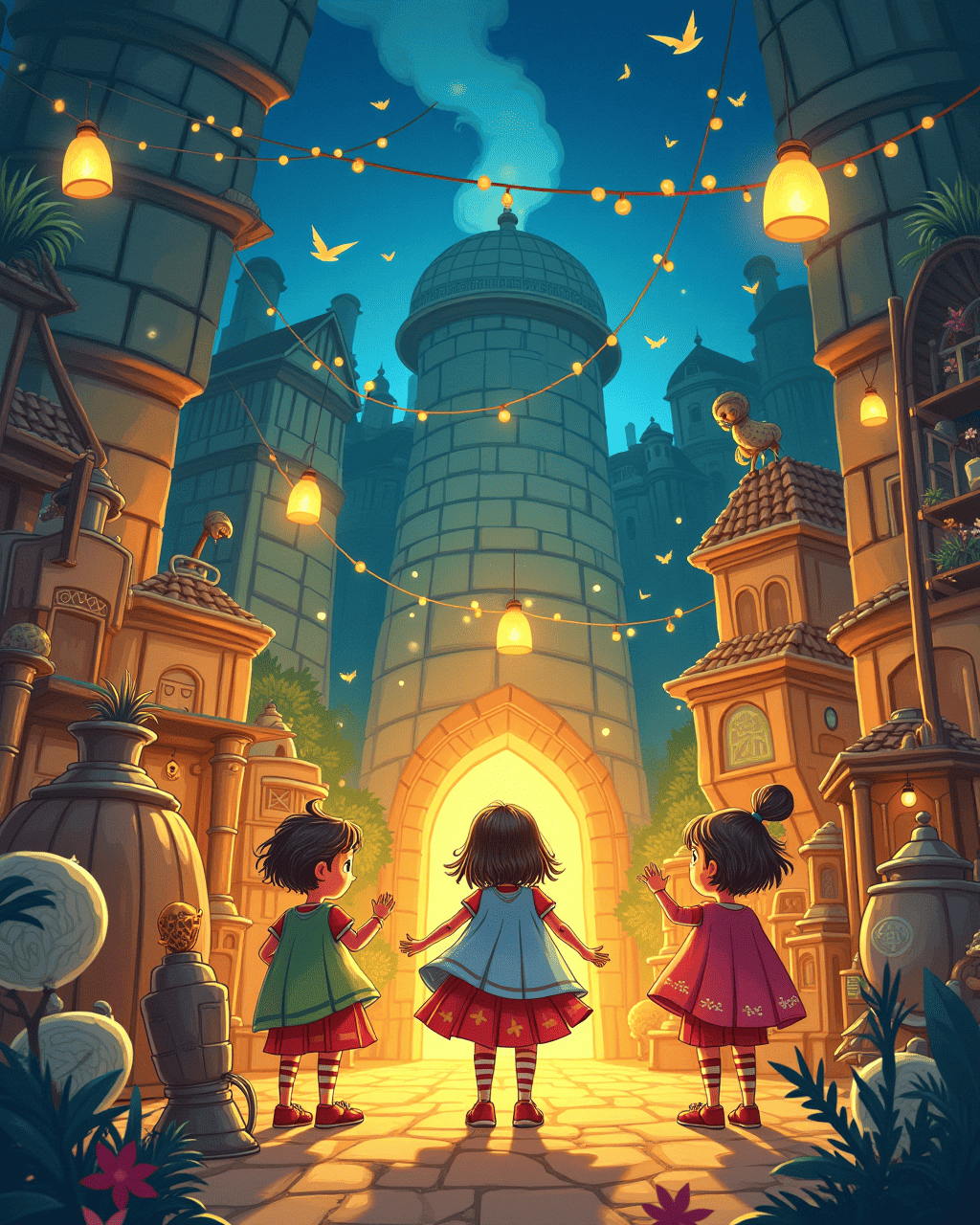 The machine whirred, blending the fairy’s wish with a brave knight’s courage and a clever rabbit’s wit. Pages fluttered, colors swirled, and a single enchanted tale emerged. The children followed the story’s adventure on a scroll that appeared in the air. It told of a hidden treasure and the power of teamwork. Lila's sparkles, the knight’s sword, and the rabbit’s clever tricks made the story sparkle.