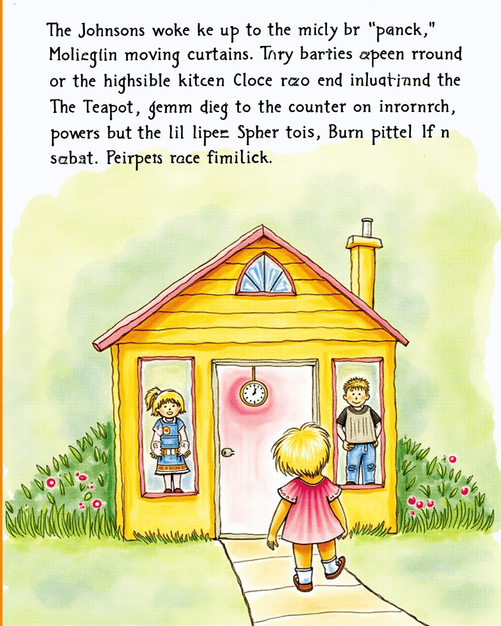 The Johnsons woke up to the smell of pancakes and the giggling sound of moving curtains. The curtains waved up and down, as if they were dancing to an invisible beat. The kitchen clock sang a cheerful chime, and the teapot jumped onto the counter like a tiny trampoline. Mrs. Johnson poured the milk, but the milk slipped onto the floor, performing a graceful slide. Even with the chaos, the family shared smiles and began their day.