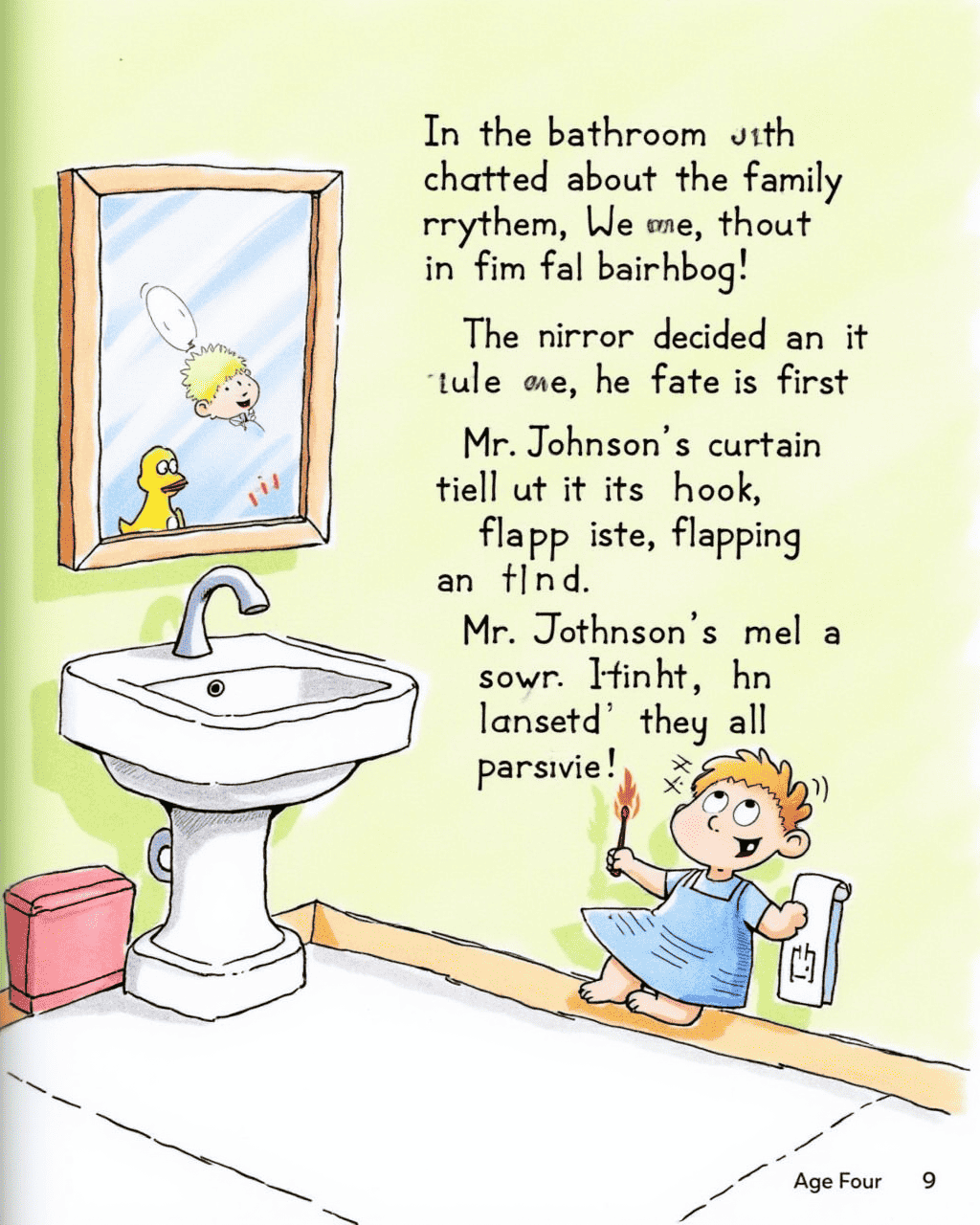In the bathroom, the tiles started to chatter about the shower’s rhythm. The mirror decided it would not reflect the family’s faces at first, instead it showed a cartoon duck. The shower curtain jumped out of its hook, flapping like a bird in flight. Mr. Johnson’s toothbrush tried to brush itself, while Mrs. Johnson’s soap slid like it had a mind of its own. Finally, they all laughed at the absurd scene.