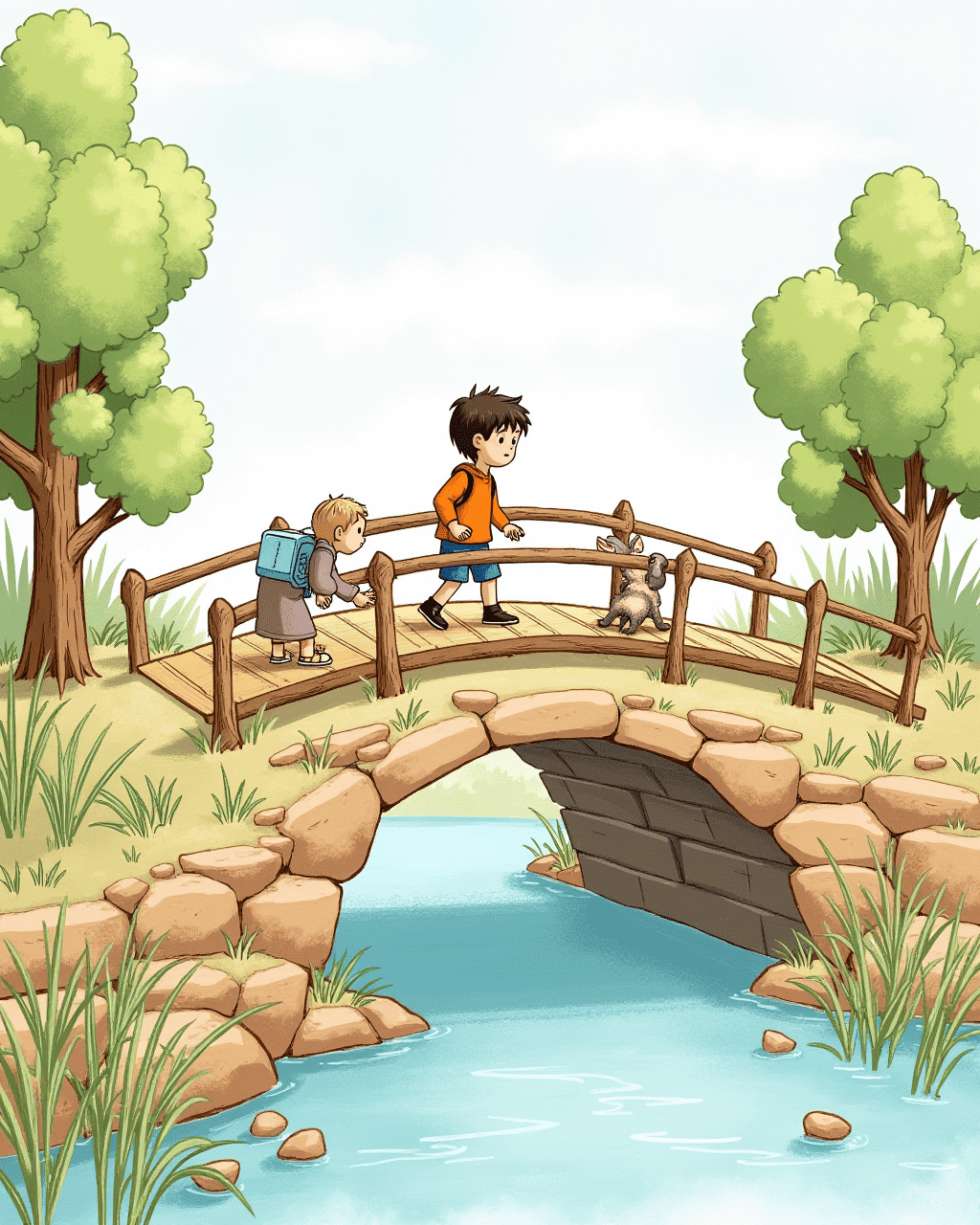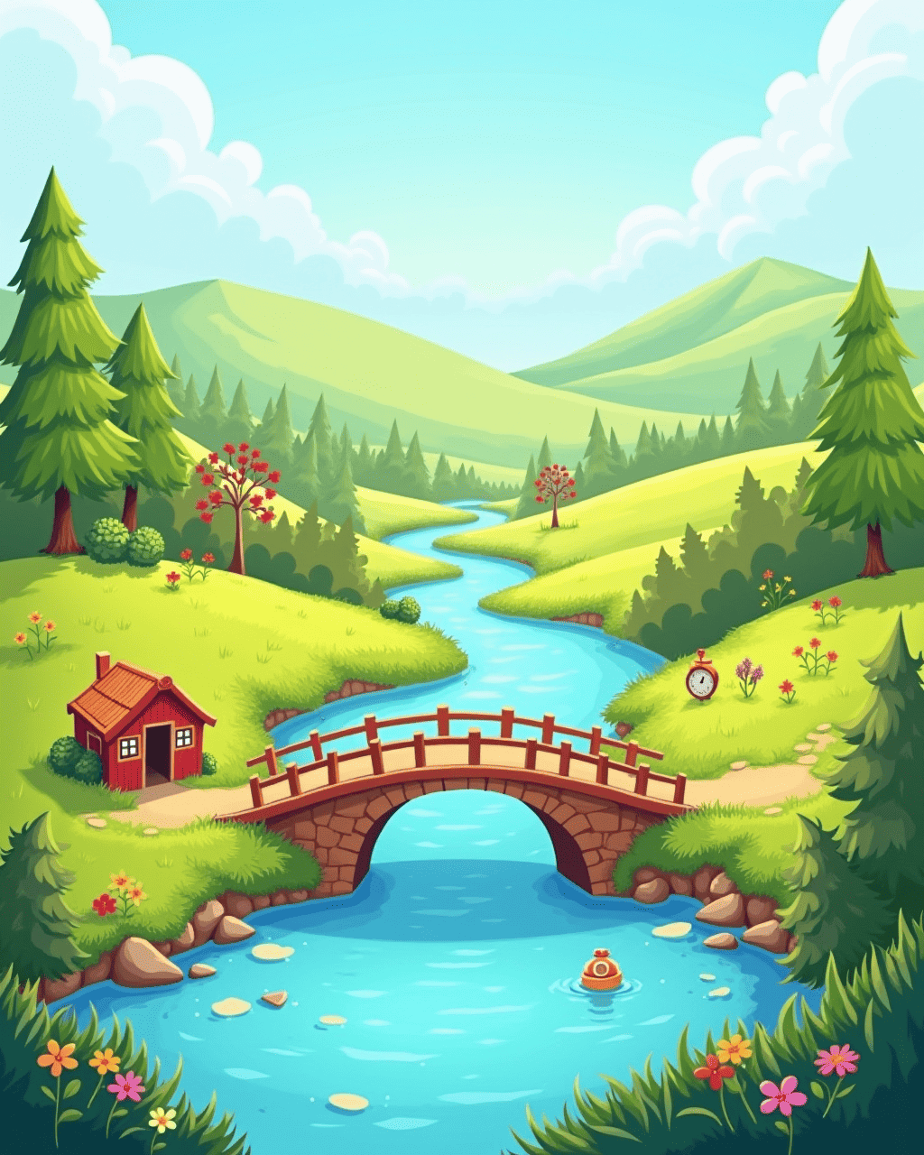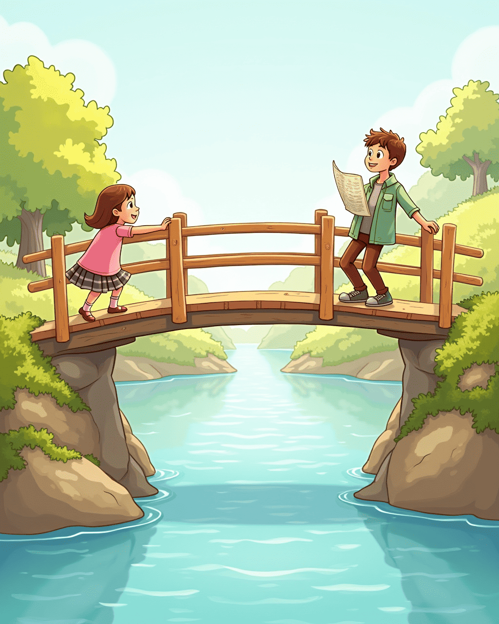 Once upon a time, in a small village, there was a wide river that split the meadow. The valley was filled with bright flowers. But the river was too deep for children to cross. Everyone could only see the other side from their windows. One bright morning, Lily and Tom decided to build a bridge.