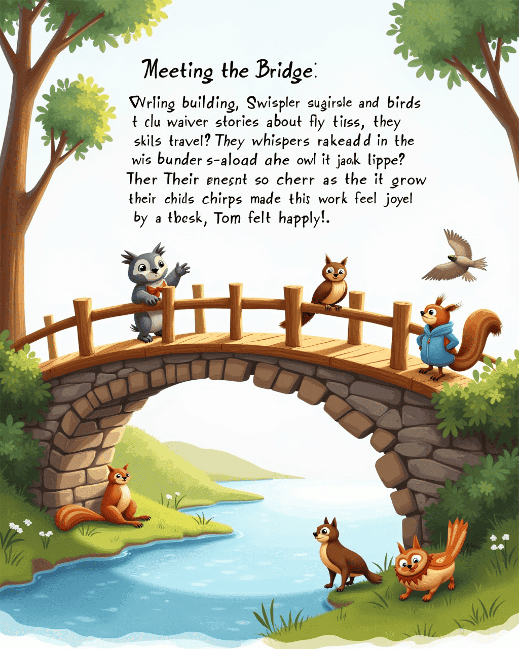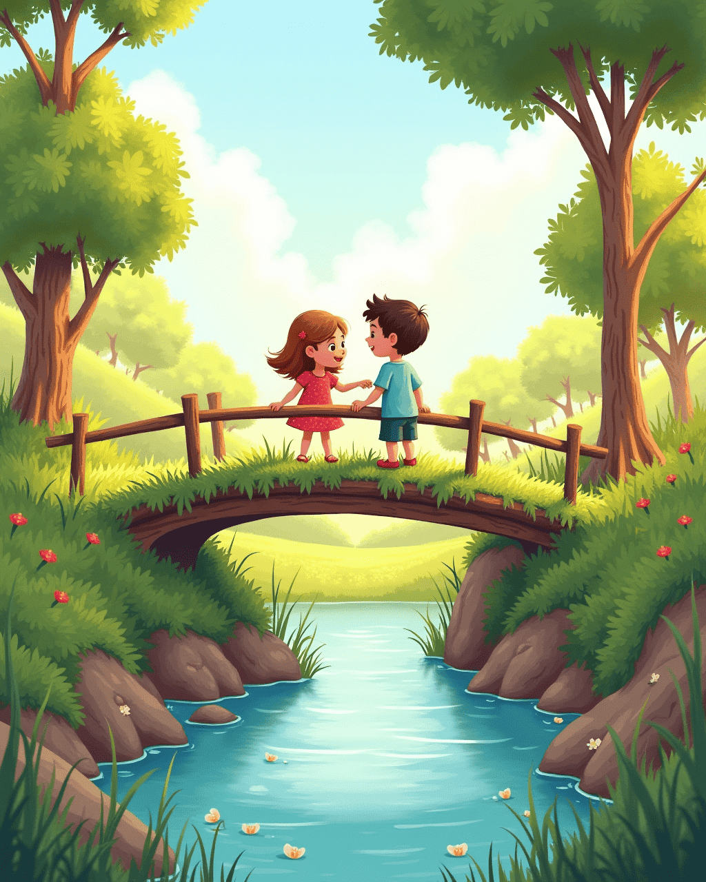 Now the children cross easily, playing at the meadow. The bridge brings laughter and songs. Lily and Tom hold hands on each side. Their friendship grows like vines. The bridge stands as a symbol of hope. The whole village celebrated a new harmony.