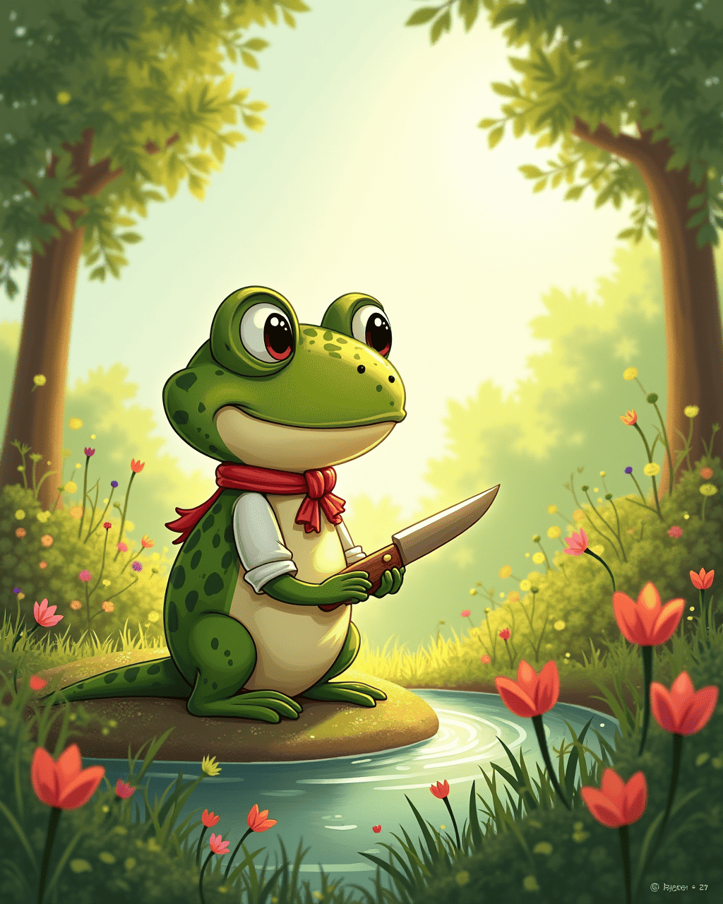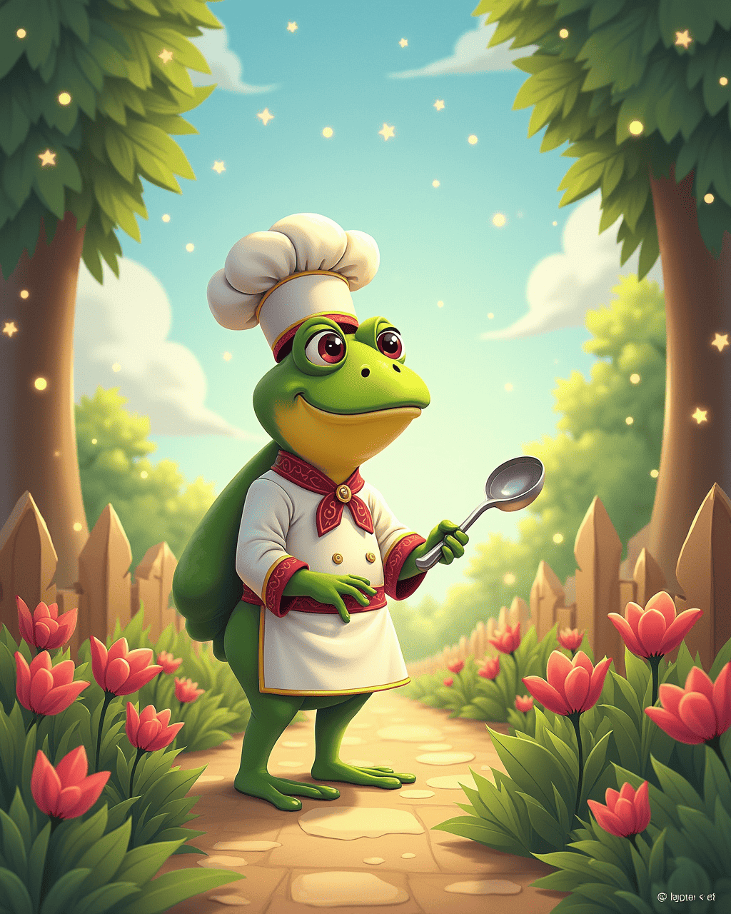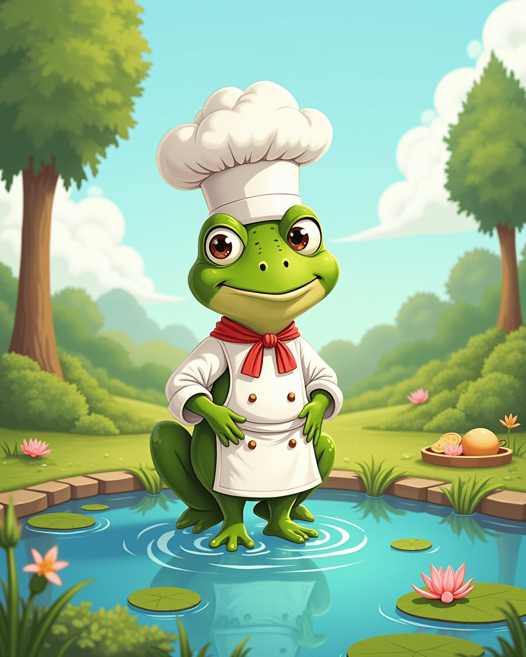 The frog, named Finn, lived near a sparkling pond in the kingdom. He spent his days hopping between lily pads, watching chefs whisk pots and plate dishes in the royal kitchen. Finn admired their skill and wished he could taste the flavors. One sunny morning, he found a sparkling feather that granted him a clever idea. He decided to prove his worth by cooking a surprise for the king.