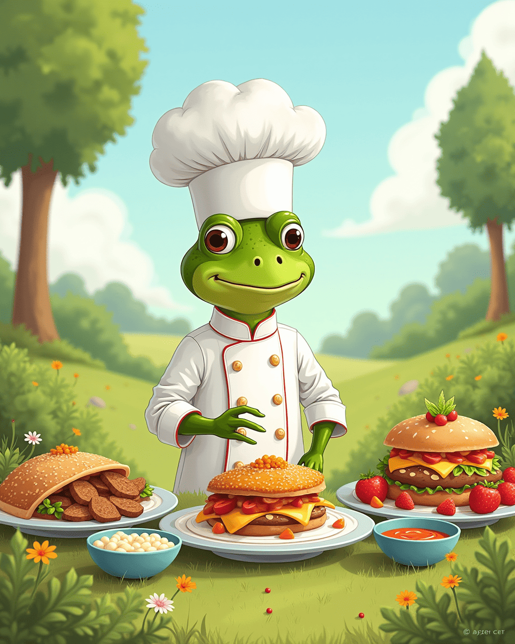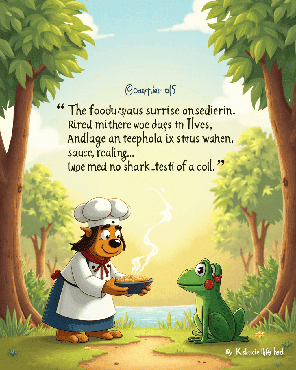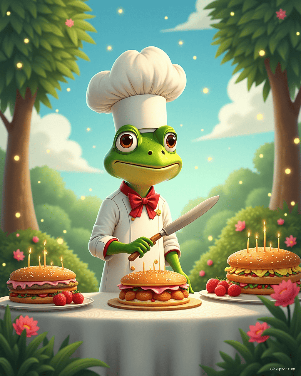 The frog, named Finn, lived near a sparkling pond in the kingdom. He spent his days hopping between lily pads, watching chefs whisk pots and plate dishes in the royal kitchen. Finn admired their skill and wished he could taste the flavors. One sunny morning, he found a sparkling feather that granted him a clever idea. He decided to prove his worth by cooking a surprise for the king.