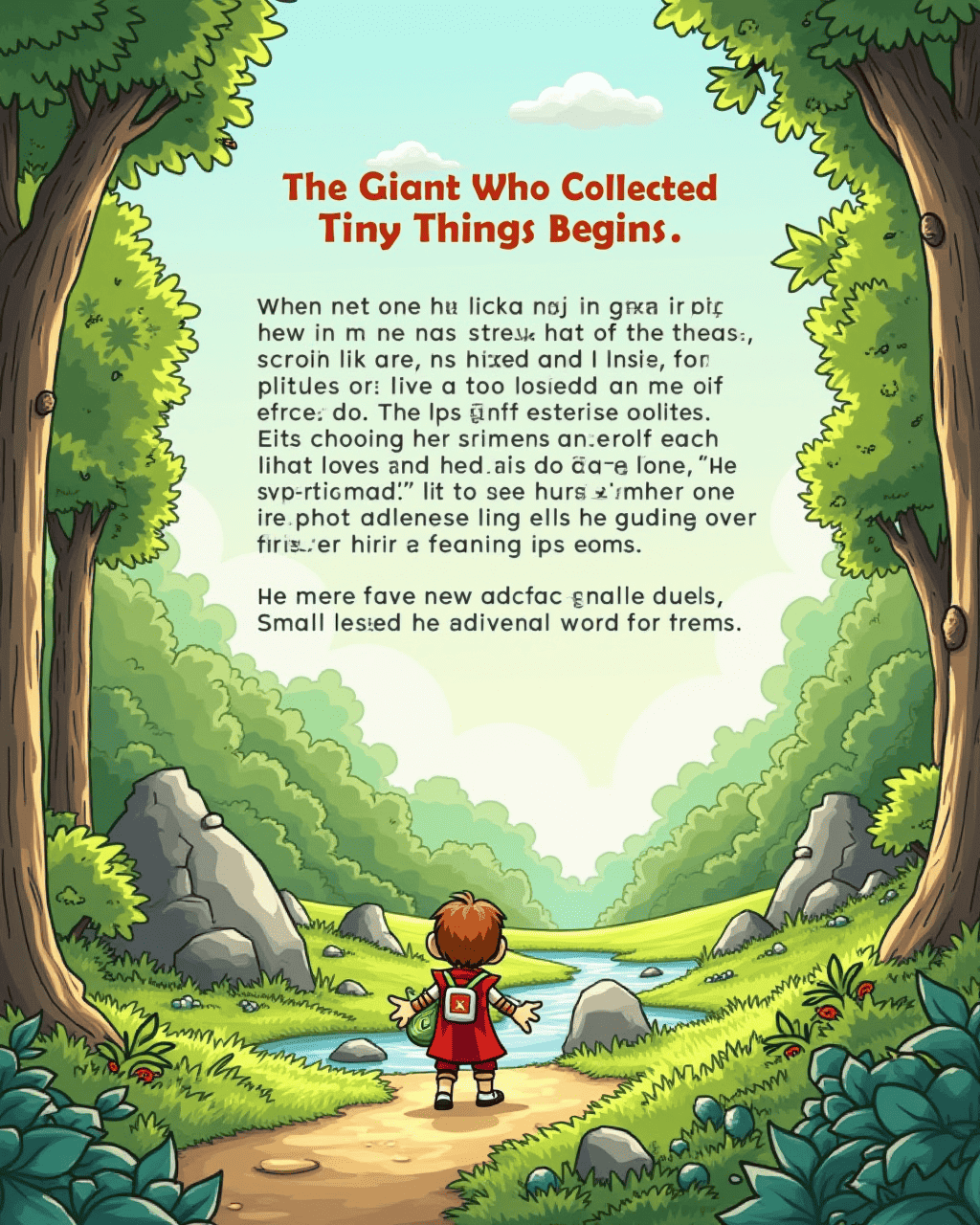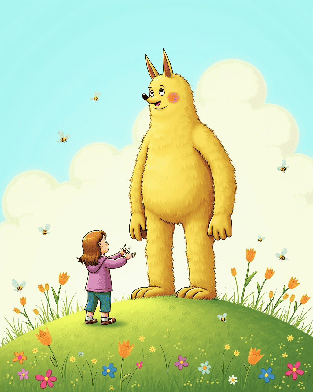 The gentle giant Max stood on the hill, feeling a quiet longing for a friend. He watched the birds, the bees, and the flowers dance around him. Max liked to touch the soft petals and listen to the wind’s whispers. But no one seemed to notice the quiet giant with the big, kind eyes. Max wanted someone to share his discoveries with.