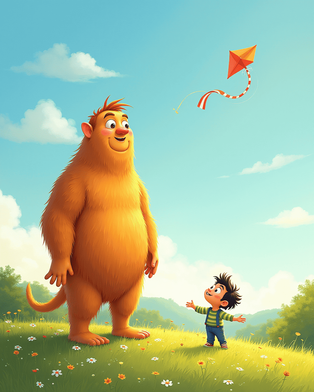 While the giant was playing, a gentle breeze lifted Max’s hair and fluttered a tiny paper kite. The kite flew high and twirled in the sun. Max watched it dance, feeling proud of his own discovery. The sky painted bright colors, and the kite seemed to bring a smile to the giant’s face. Max’s world suddenly felt brighter and full of friends.