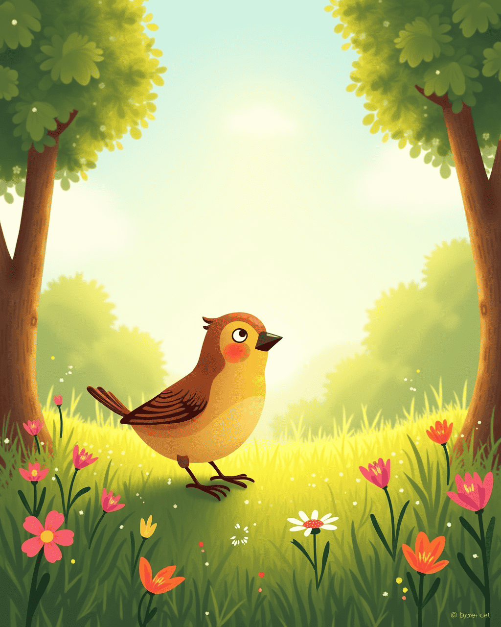 Little Milo the sparrow lived in a bright, sunny meadow. He loved to hop from tree to tree, singing cheerful chirps. But Milo was always curious about the sounds in the wind, wanting to know what they carry. One rainy afternoon, he began to hear a faint whisper from the trees. The whisper guided him to a hidden song hidden in the forest.
