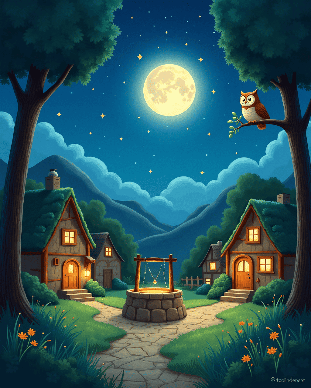 Guided by the wind, Milo flew into a quiet valley and discovered a hidden village. The houses were built from soft moss and twinkling firefly light. In the center stood an old stone well, echoing with memories. Milo found an ancient owl perched on a branch, its eyes reflecting the moon. The owl invited Milo to join a silent listening circle.