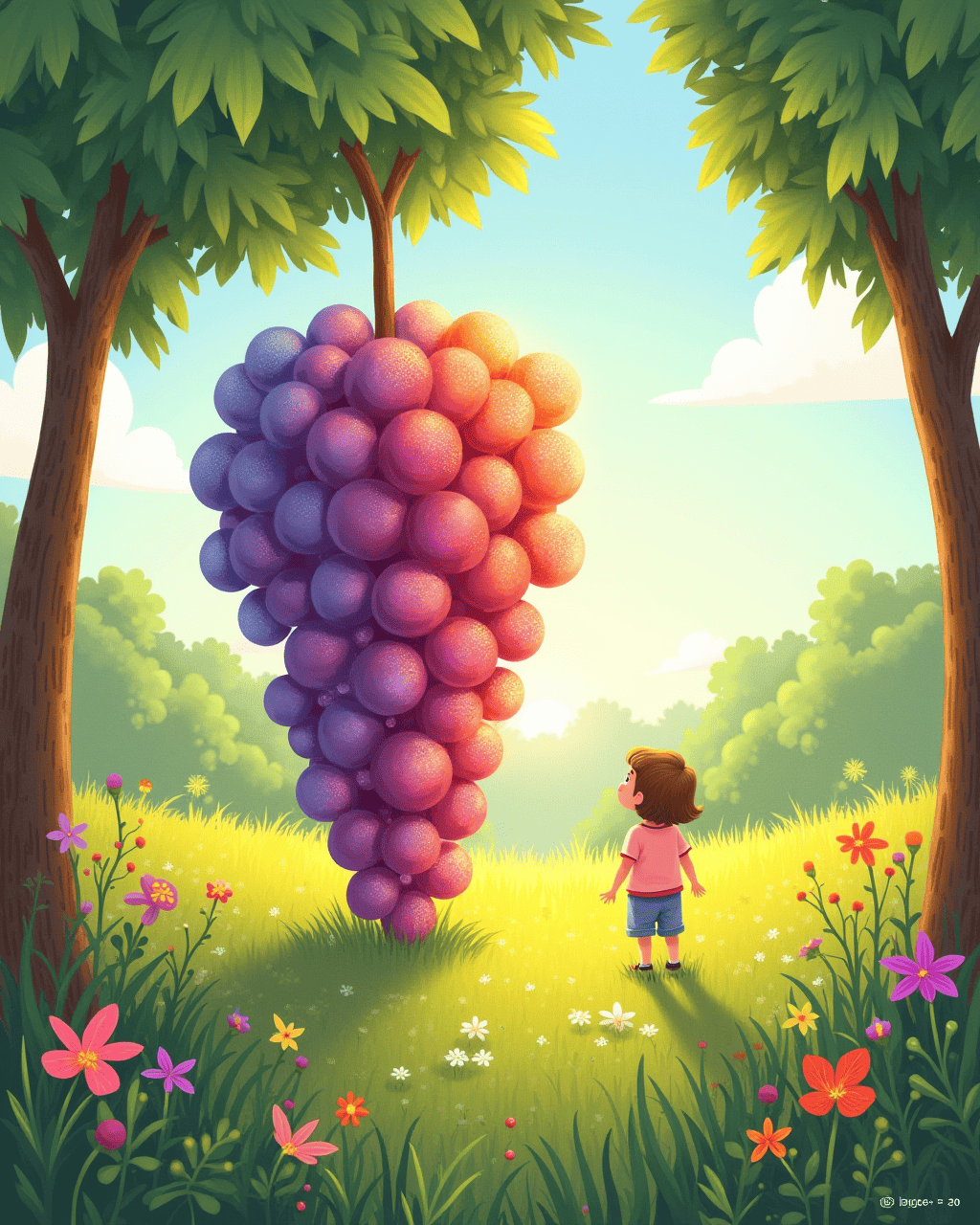 In the green valley of Lily’s Farm, a single grape found itself surrounded by bright sunshine and gentle wind. Lily, a bright child, giggled as she plucked the grape from the vine. Little did she know, the grape was special. It began to throb softly, promising a surprise. The moment Lily’s fingers slipped, the grape started to grow, shimmering like a tiny star.