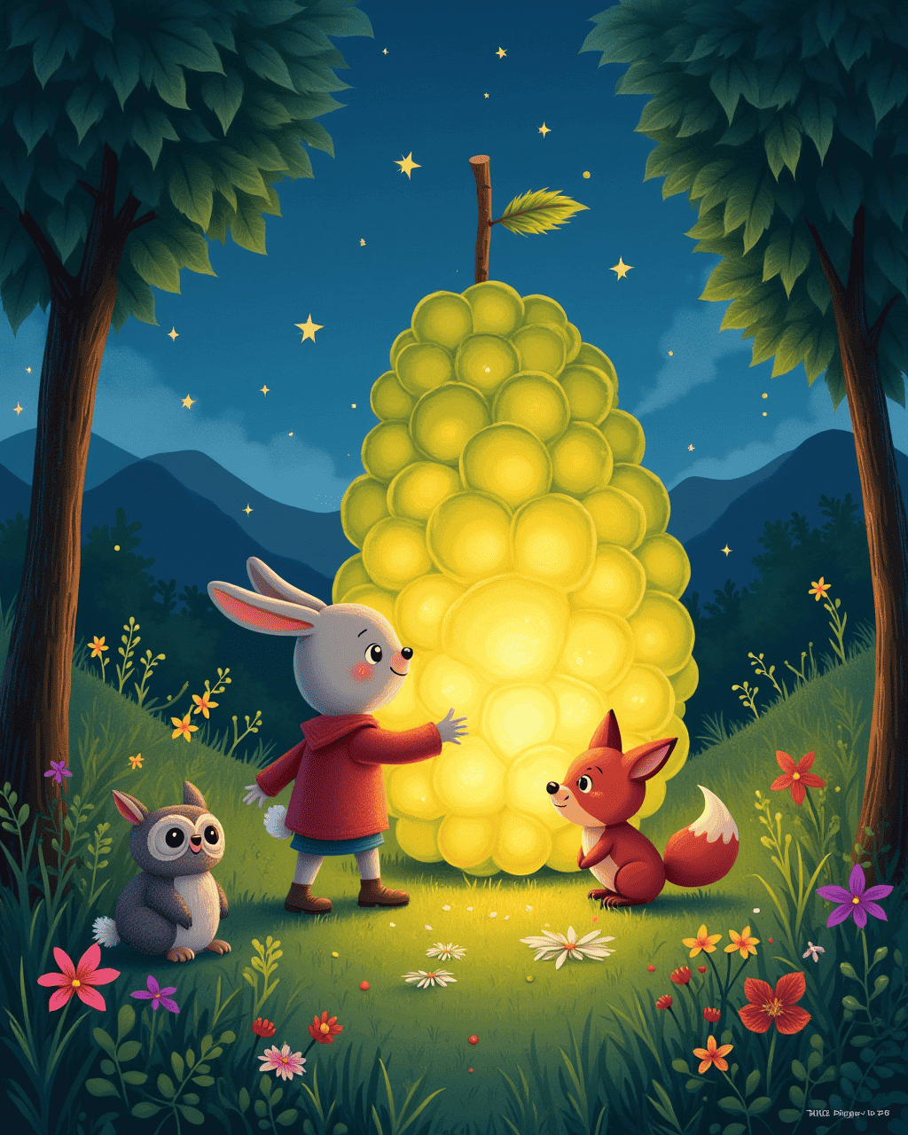 Night fell and the grape's glow grew brighter. It sang a soft lullaby that echoed through the hills. The rabbit, the owl, and even the mischievous fox curiously approached. They pressed their noses against the grape, feeling its warmth. The grape hummed, and the forest became enchanted with sparkling lights.
