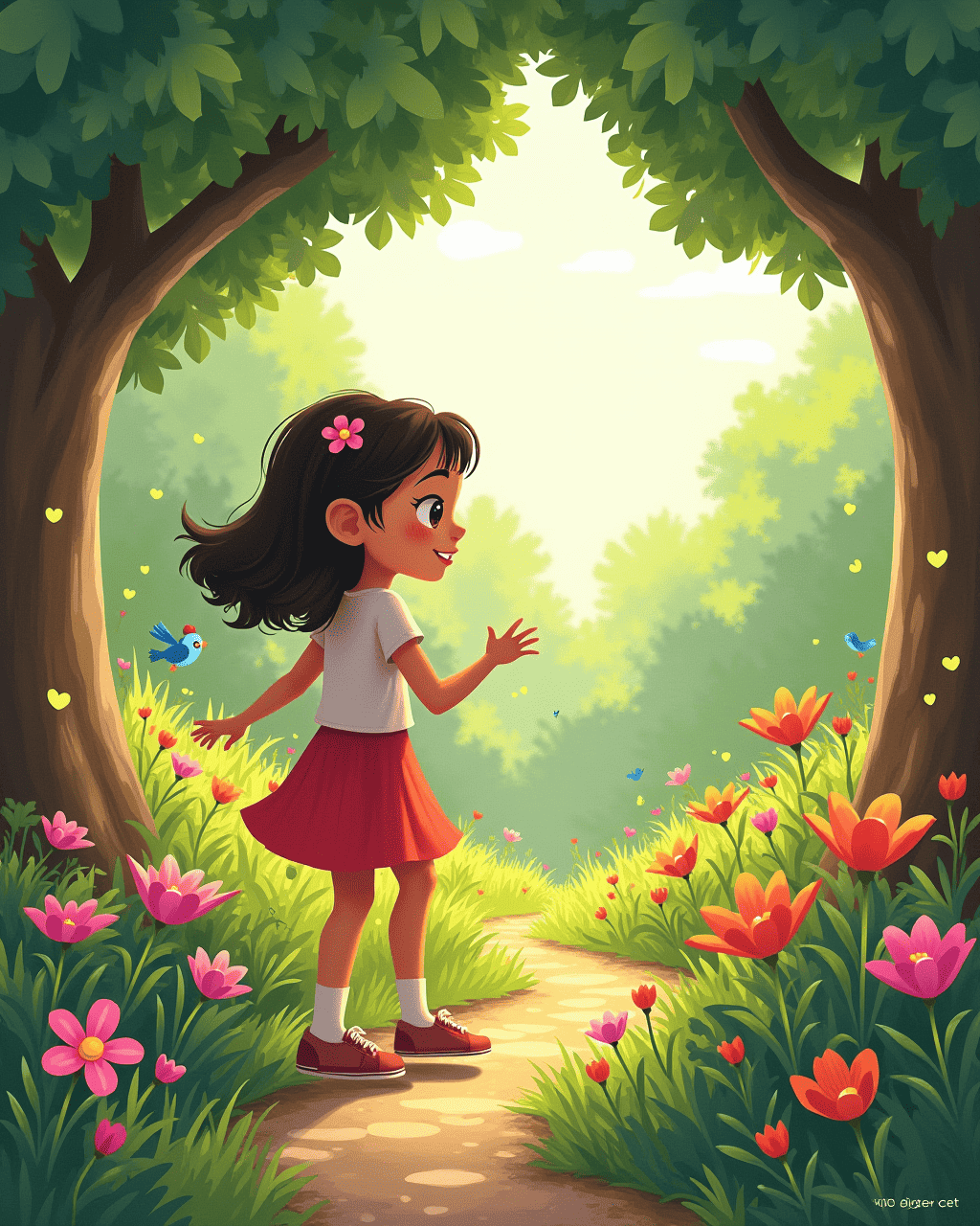 Beyond the oak, Lily stepped into a garden filled with colorful flowers that sang.