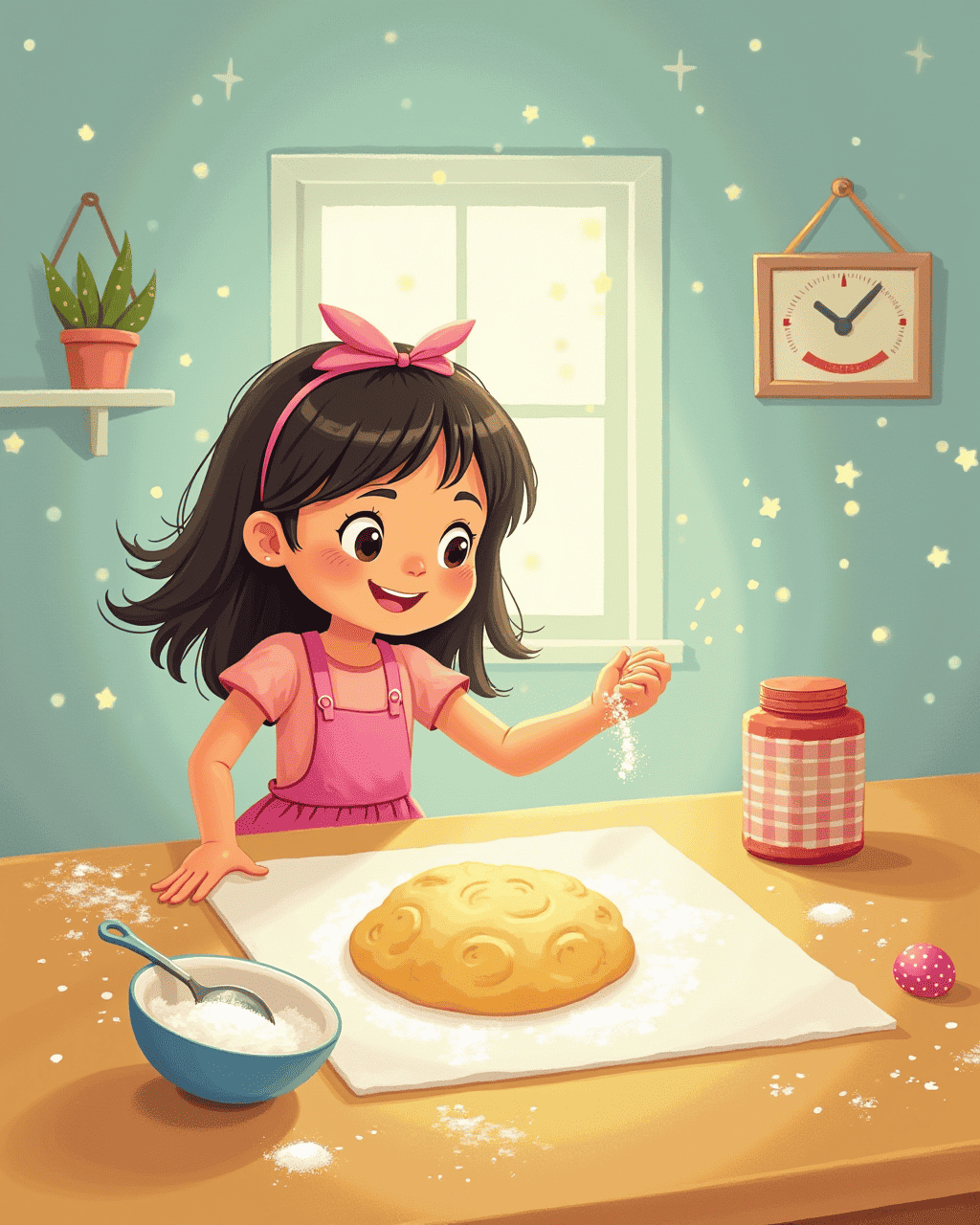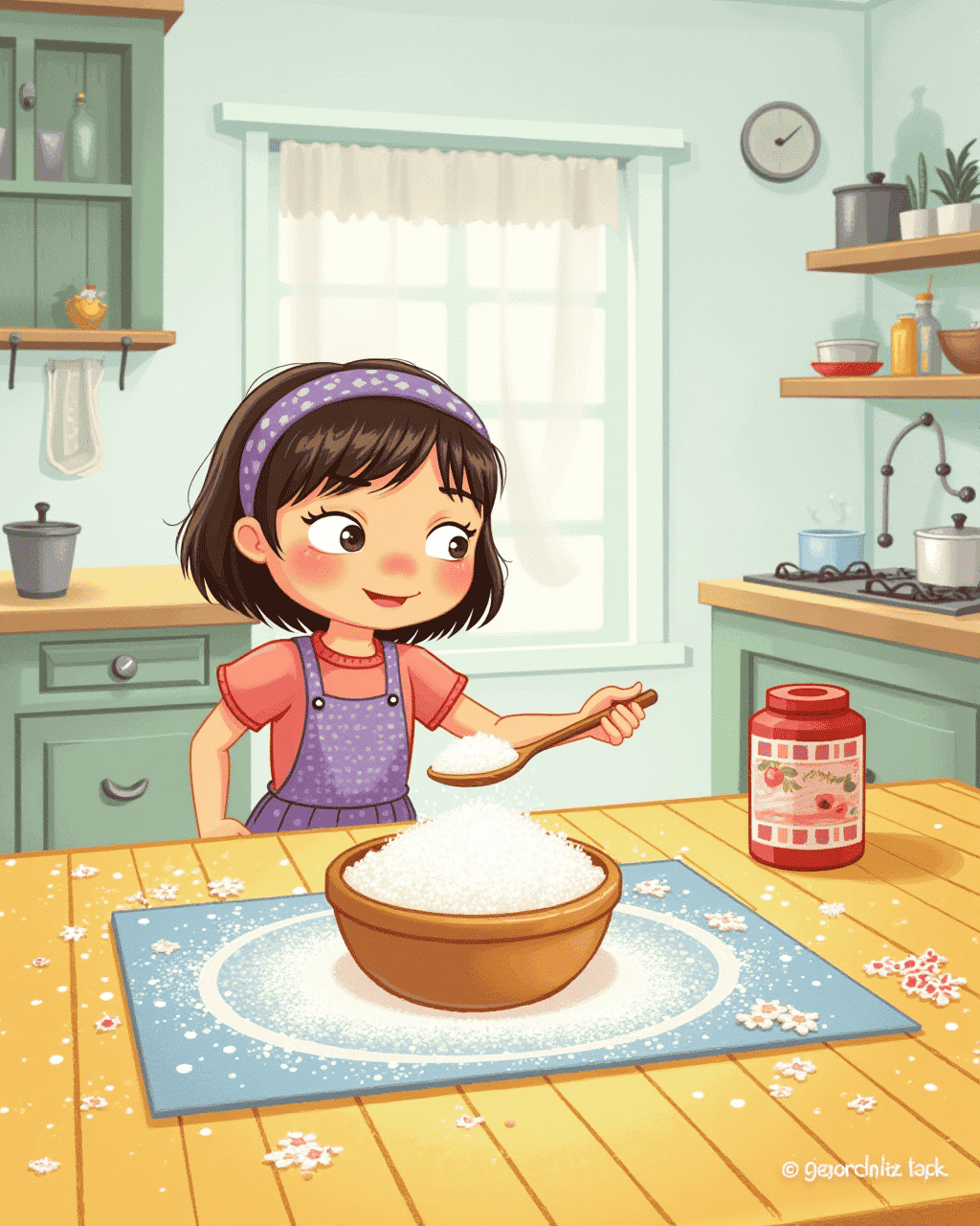 The bowl of sugar twitched as Mia poured it in. She whispered “sweetness” and the sugar glittered. A gentle hum grew around the kitchen. The flour followed like snow falling from the spoon. Mia felt a warmth spreading in her fingers.