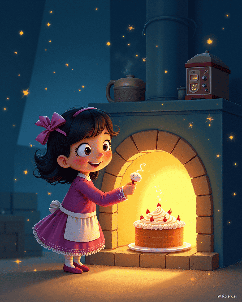 The oven door trembled as Mia pushed it open. Inside, a soft golden light batched the mixture with a warm glow. The heat hummed like a lullaby, inviting the batter to rise. Sparks of glittery sugar spiraled into the air, dancing around the walls. When the timer chimed, the cake emerged, shimmering like a star.