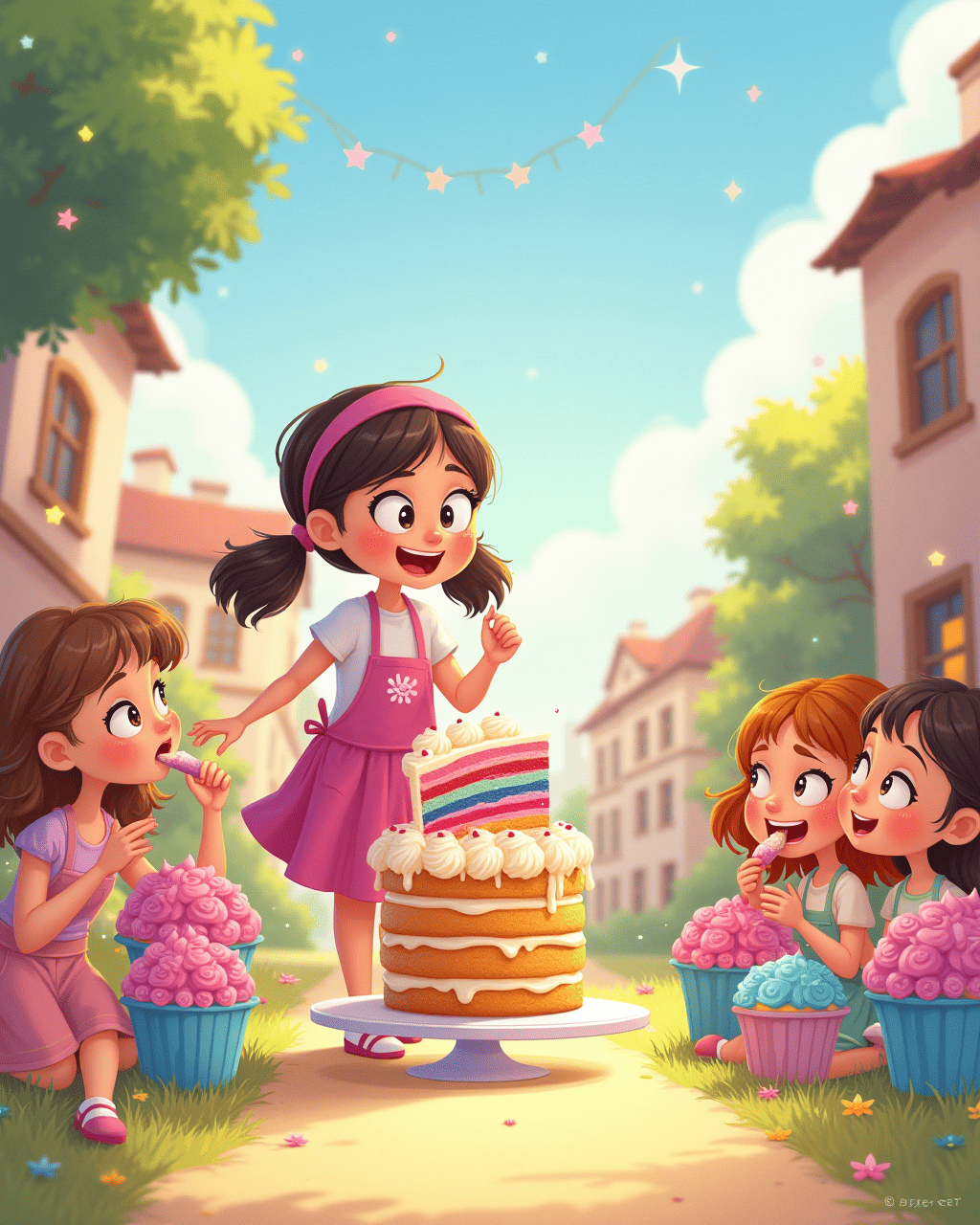 The town woke up to a vibrant rainbow cake, each slice showing a spectrum of flavors. Children ran around tasting the sweet dreams. Mia watched their smiles spread like sunshine. The entire town felt a sudden burst of happiness. They named this day the “Day of Sweet Wonders.”