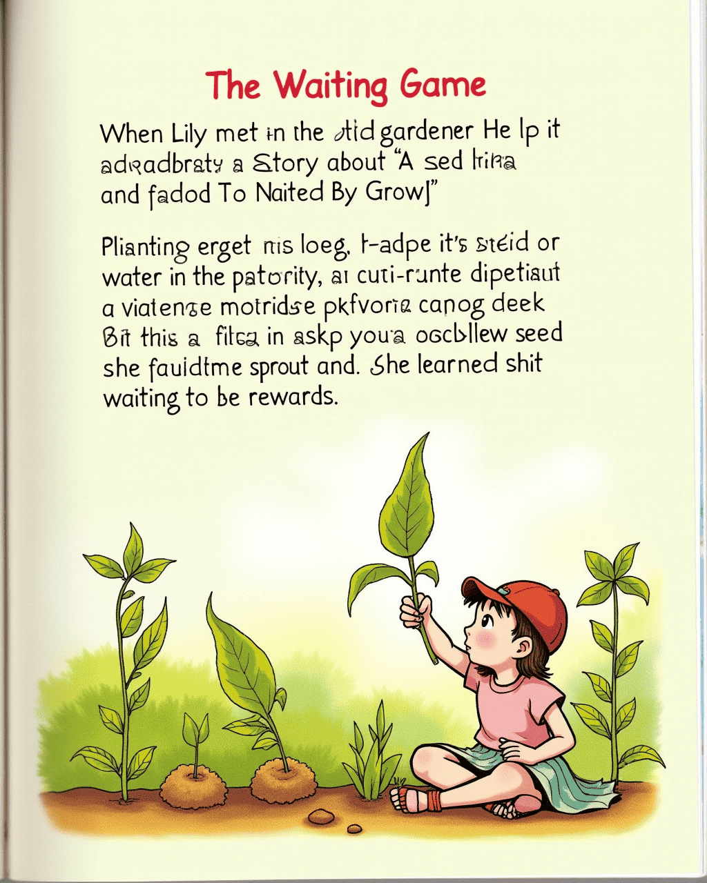 When Lily met the old gardener, he told her a story about a seed that waited to grow. He asked her to plant the seed and keep water in the morning and evening. Lily planted eagerly, but she forgot to water the seed on a hot day. After a week, she saw the seed start to sprout, and her patience paid off. She learned that waiting can bring rewards.