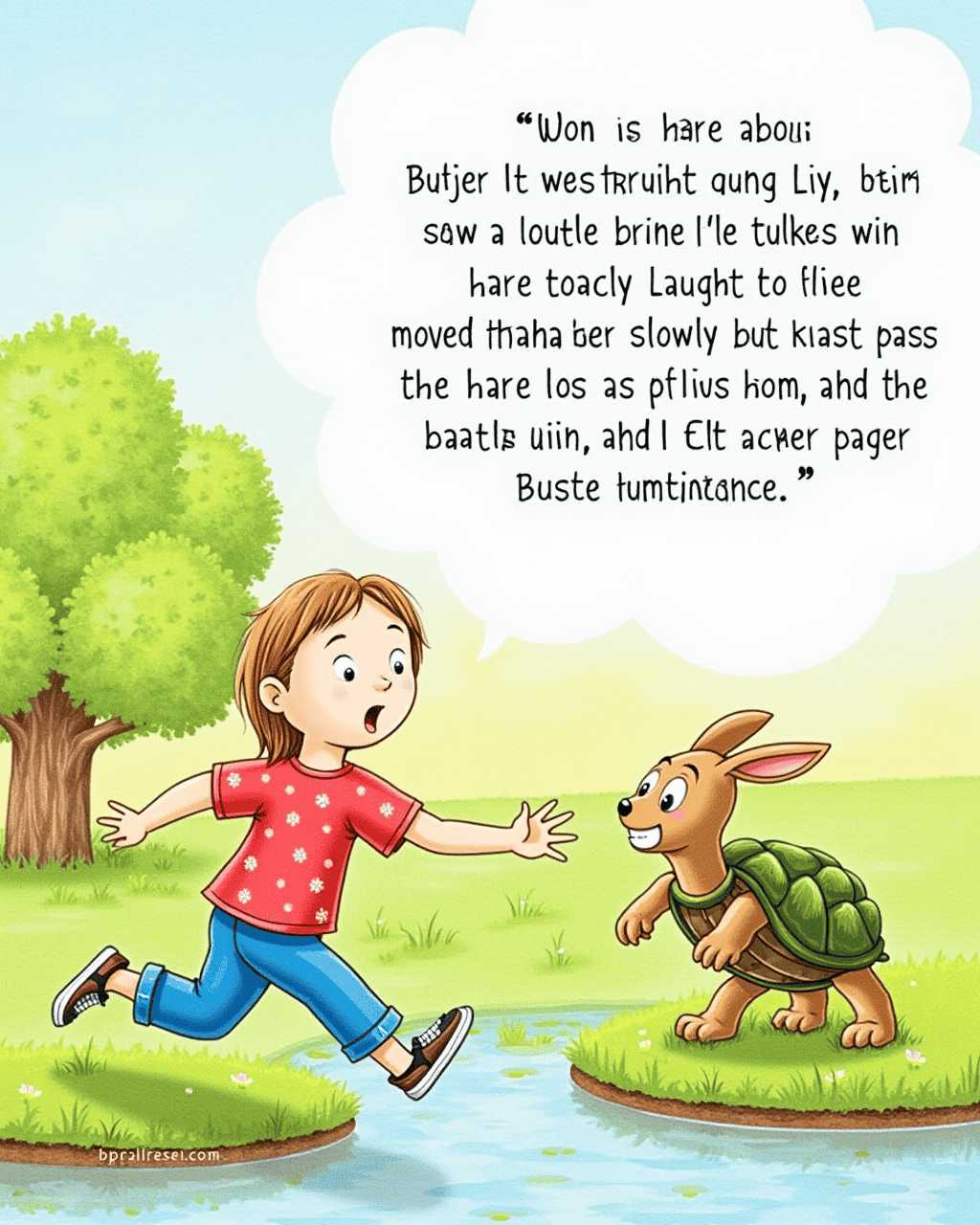 While walking along the river, Lily saw a turtle and a hare racing. The hare laughed, thinking he would win immediately. The turtle moved slowly but steadily. The hare took a nap, and the turtle passed him. Lily felt proud, as the turtle showed that patience can beat impatience.