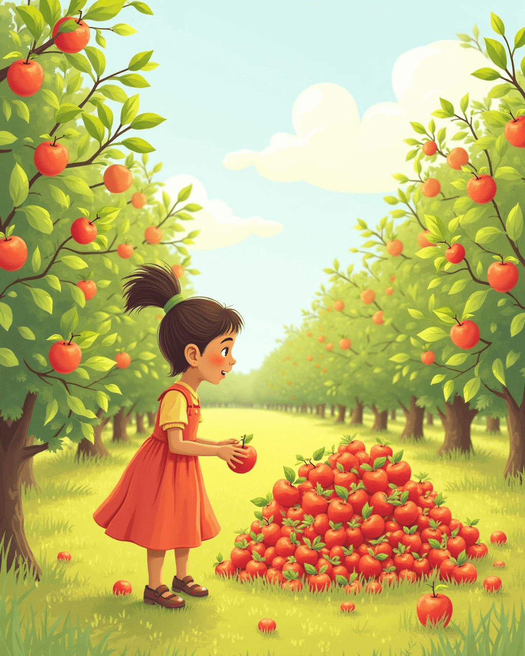 During spring, Lily helped her grandmother harvest fruit on the orchard. The apples grew slowly and needed sunshine, water, and care. They took months to ripen, and Lily had to wait for them to become perfect. When the fruits finally fell, the entire family celebrated, praising Lily's patient hands.