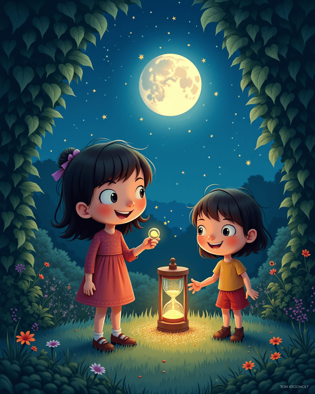 At dawn, Lily found the clockmaker's cabin behind a curtain of vines. Inside, an old man with silver hair welcomed her with a warm smile. He handed her a tiny hourglass, its sand shimmering like stardust. "Hold it tightly," he said, "and imagine the time you’d like to slow." Lily closed her eyes and whispered, "I want to pause the moment."