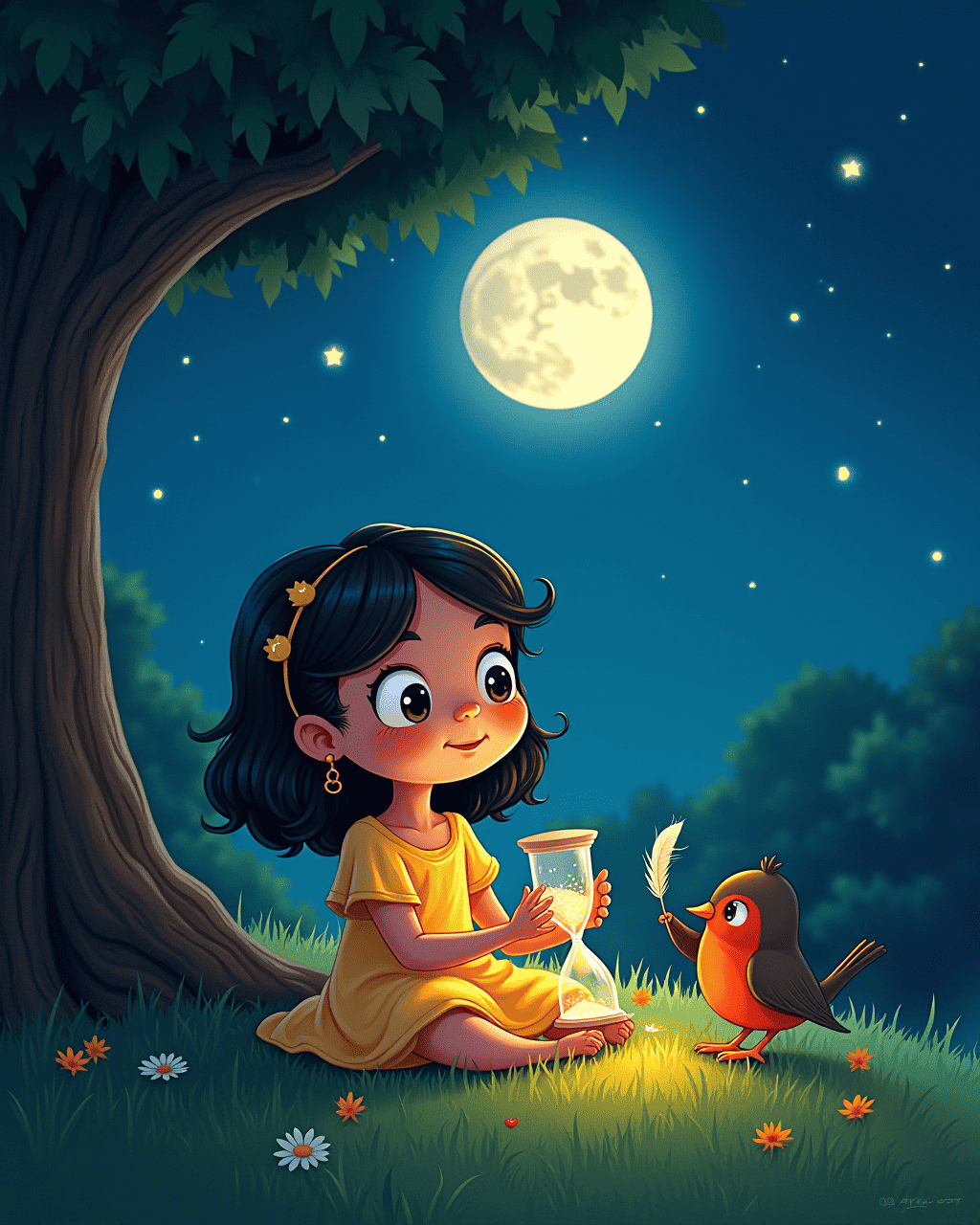 After the sun vanished, Lily sat under the oak, her hourglass glowing softly. She understood that slowing time did not trap moments but gave them space. Her heartbeat matched the sand’s slow descent, each grain a gentle sigh of new possibilities. She promised to share this gift with anyone who needed a pause. Her robin friend returned, clutching a small feather that sparkled like a star.
