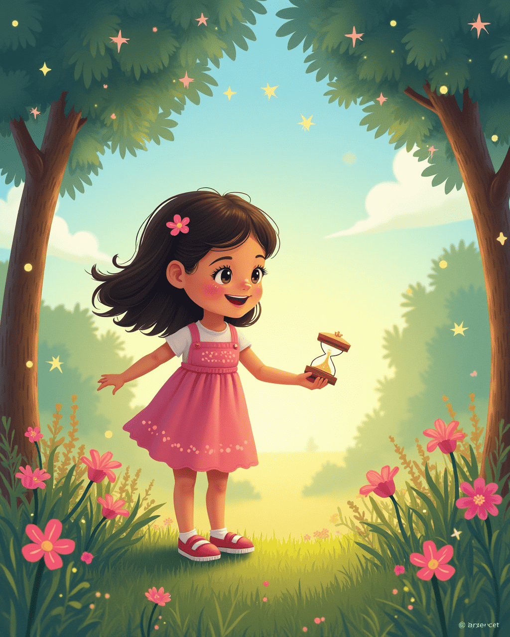 When dawn finally came after the twilight, the hourglass in Lily’s hand was empty. She felt the familiar tick again, but this time it felt easier, slower, kinder. The park was bright, and her friends gathered, sharing stories that seemed longer because they were told slowly. Lily smiled, realizing that the true magic was not stopping time, but learning how to enjoy each gentle beat. And so, she kept the small hourglass as a reminder of how patience can turn ordinary days into sparkling adventures.