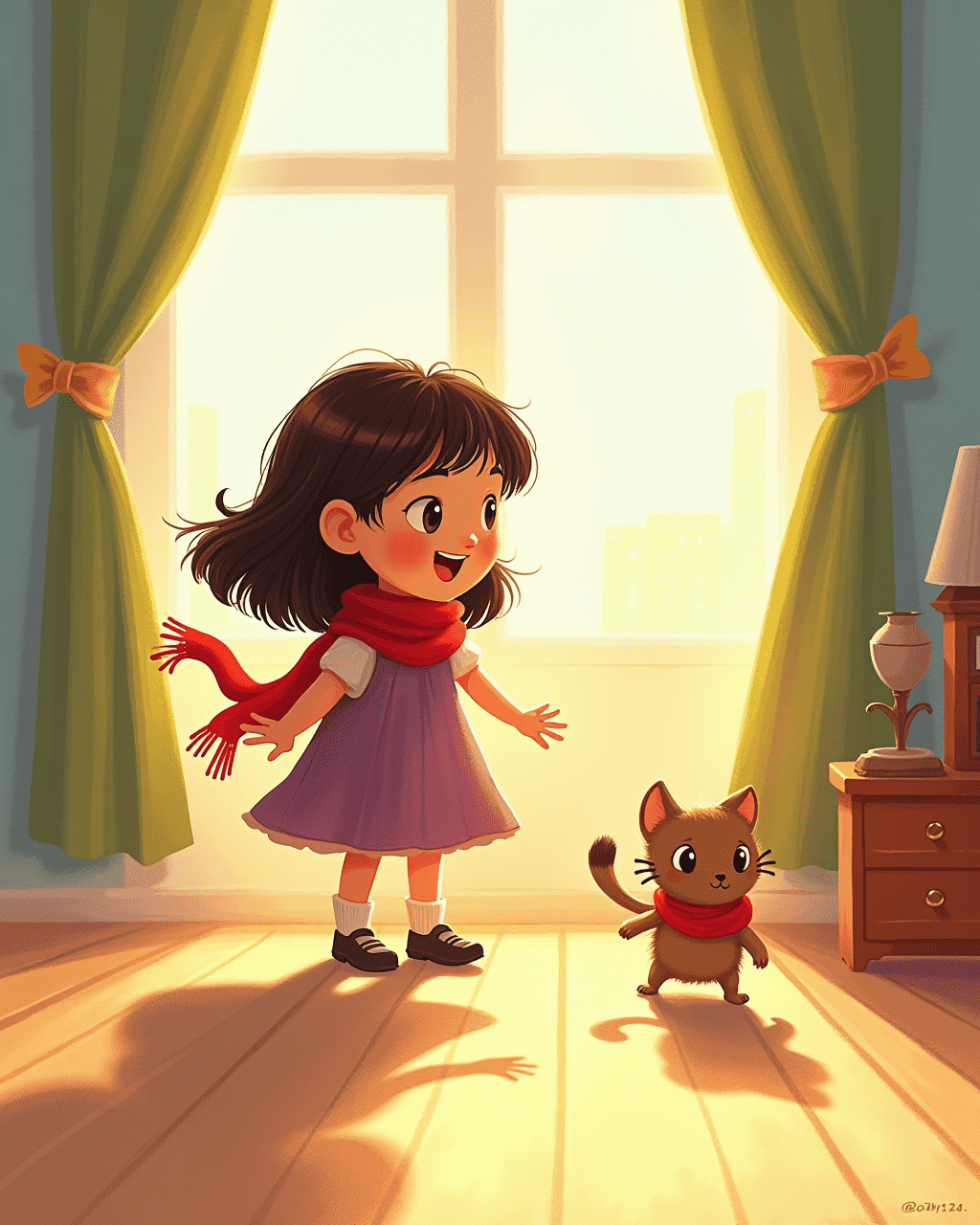 Anna woke up with a giggle, her shadow stretching long behind her on the bedroom floor. She whispered, "Today will be grand," and clicked the lights on the lamp. As she draped her red scarf, the shadow shifted, wiggling like a playful kitten. Anna laughed, delighted by this little partner in mischief. She promised to follow it through the day, curious about its tricks.