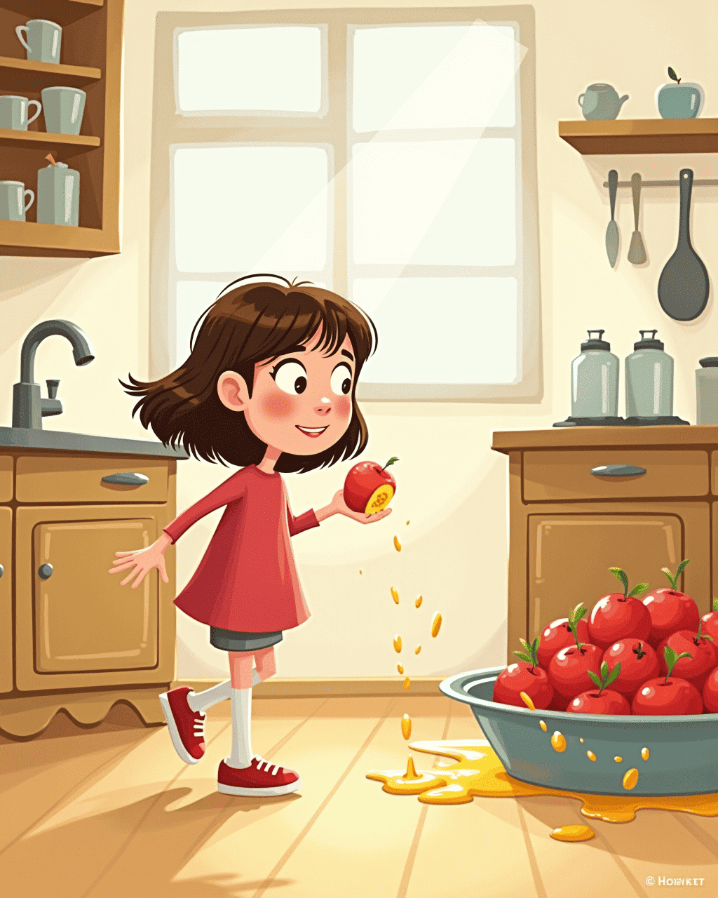 In the kitchen, Anna's shadow stretched across the countertop, forming a hand that reached for the apple pile. The apple slipped, and the shadow giggled louder, splashing juice on the table. Anna jumped back, splatter in her hair, but couldn't stop the giggle itself. She decided to keep an eye on her shadow so it wouldn't cause too much trouble. The shadow nodded, eager to show its next surprise.