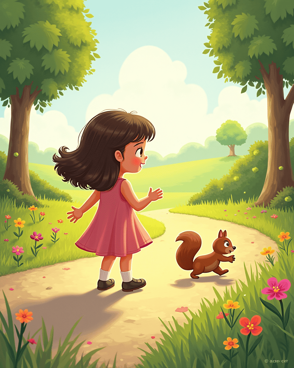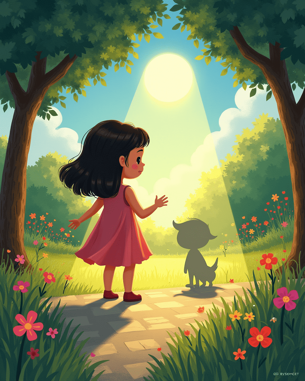 Later, she went to the park, and the shadow followed, trailing behind her at a jaunty pace. A squirrel darted across the path and the shadow leapt to catch it. The squirrel hopped to another tree, leaving Anna and her shadow smiling. Near a pond, a duck splashed, and the shadow mirrored the splash, dancing on the air. Anna clapped her hands, thrilled that her shadow could join her in such playful moments.