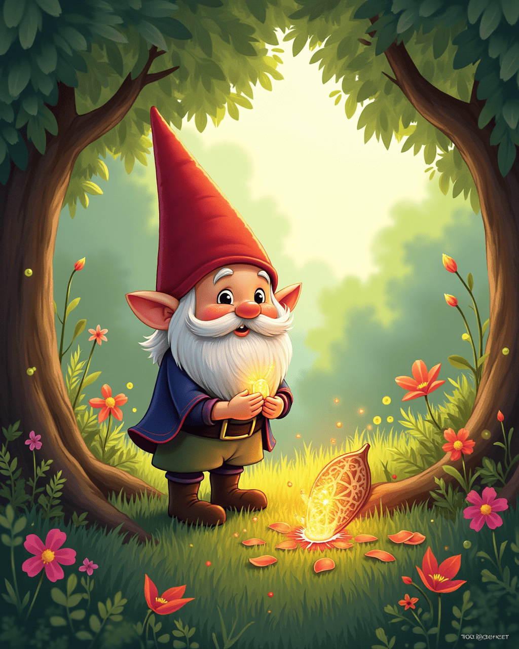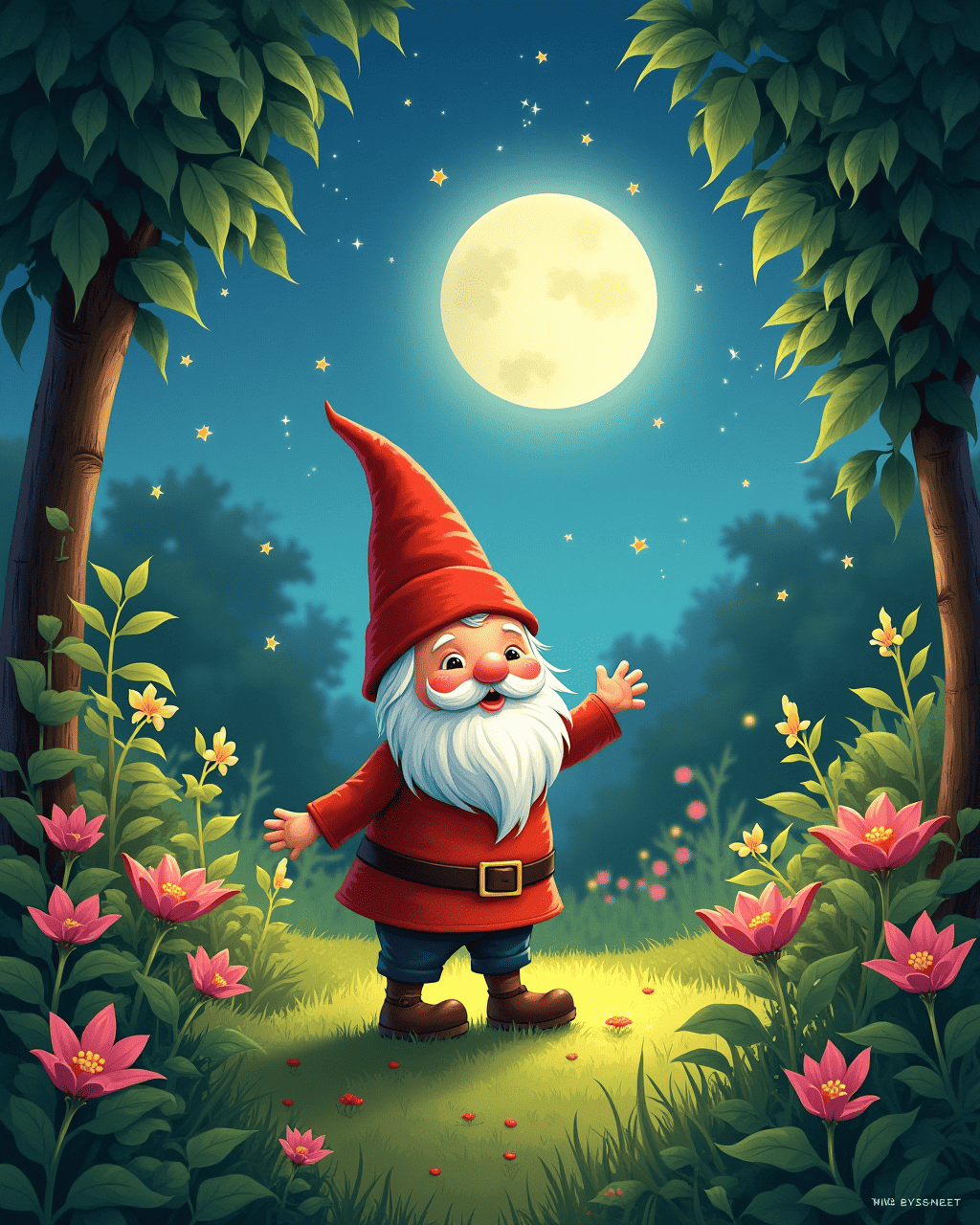 With the seed’s bloom, the garden glowed brighter than ever, turning midnight hues into a spectrum of wonder. Children and creatures danced together, singing songs of gratitude to Gilly the gnome. Gilly, once shy and small, now shone as a beacon of hope for all. The garden’s glow became a legend that travelers visited, hoping to taste its shimmer. And every night, Gilly would watch the stars flicker, knowing their sparkle was carried by his humble lantern.