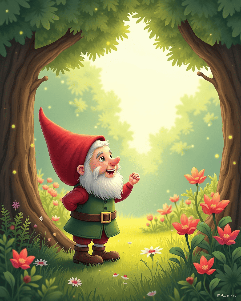 The wind hummed a soft lullaby as Gilly stepped into the misty clearing. A silver leaf hovered near the old oak, glinting like a forgotten treasure. Gilly pressed his nose against the cool bark and whispered a wish for a bountiful garden. A tiny firefly flickered in rhythm, brightening the whisper of his heart. The forest seemed to breathe, ready to grant the tiny gnome’s secret desire.