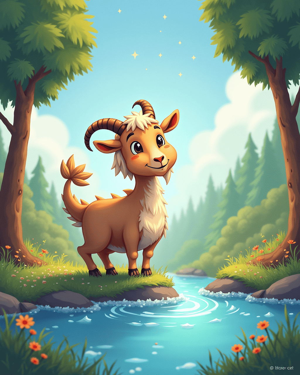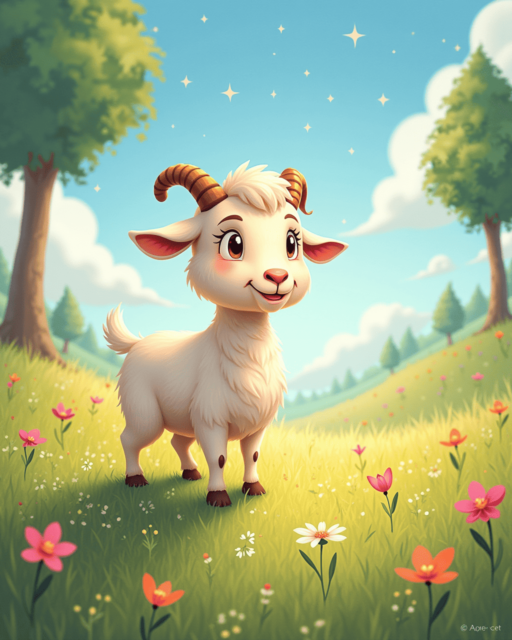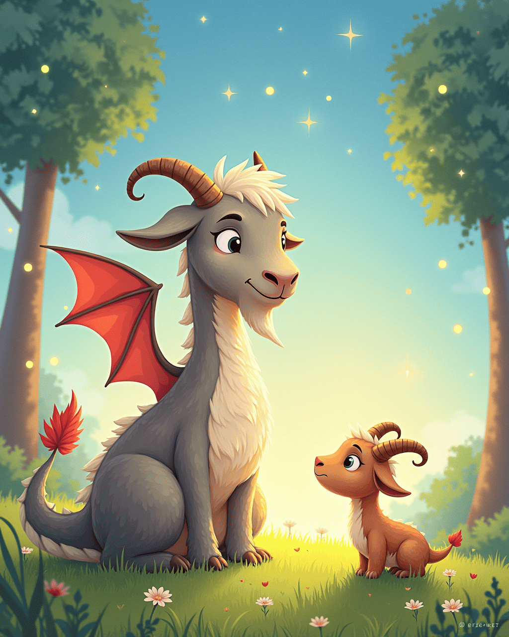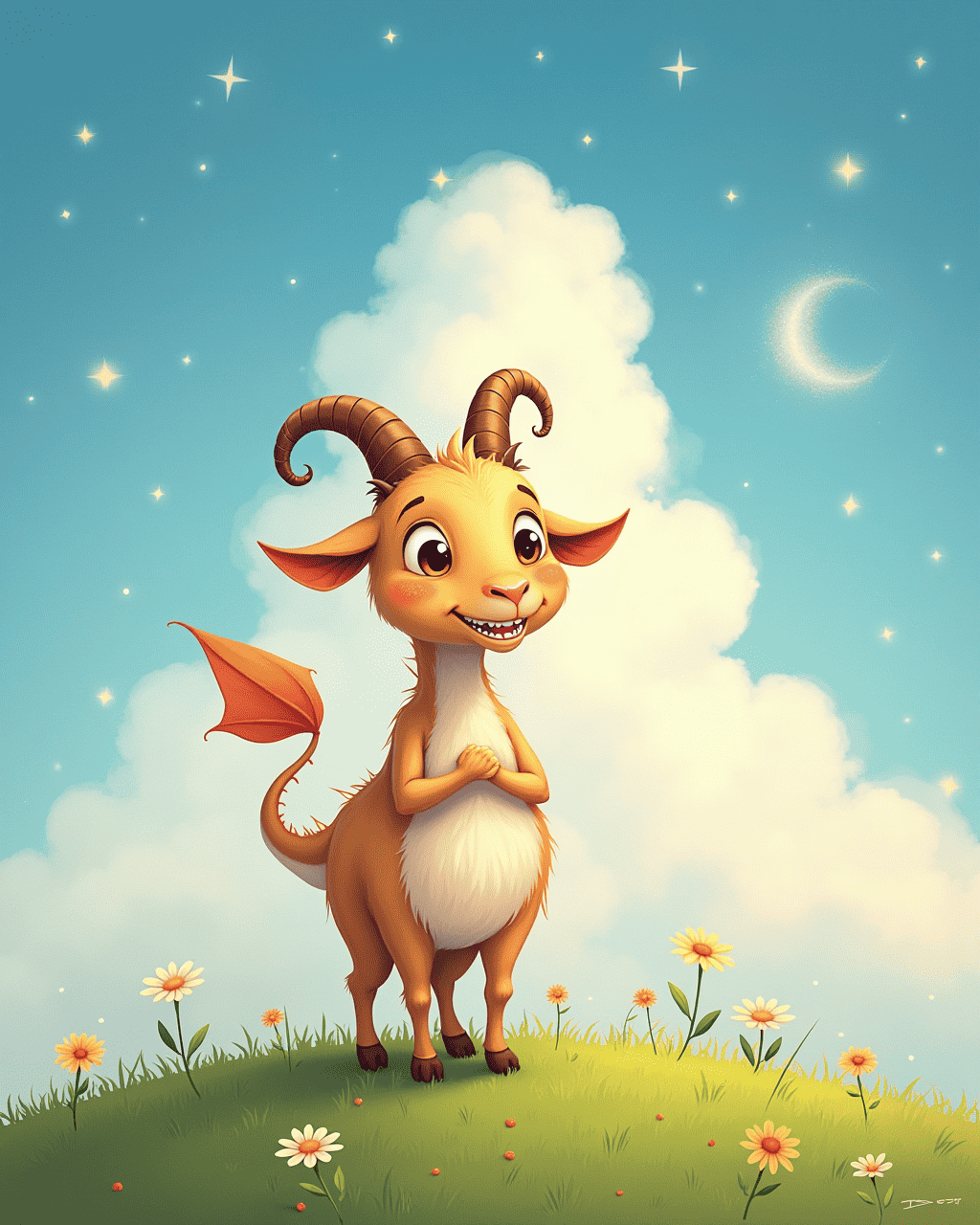 Little Milo, a curious goat from Green Meadow, loved to look up at the sky and imagine himself soaring like a dragon. He would stretch his neck and twirl his tail, pretending to breathe fire with his eyes. Every night, Milo would dream of flying over clouds, hearing a thunderous roar that made the stars shine. He told all his friends the tales of how a dragon would guard a hidden treasure beneath the tallest hill. Despite their gentle laughter, Milo stayed determined to prove his dragon heart.