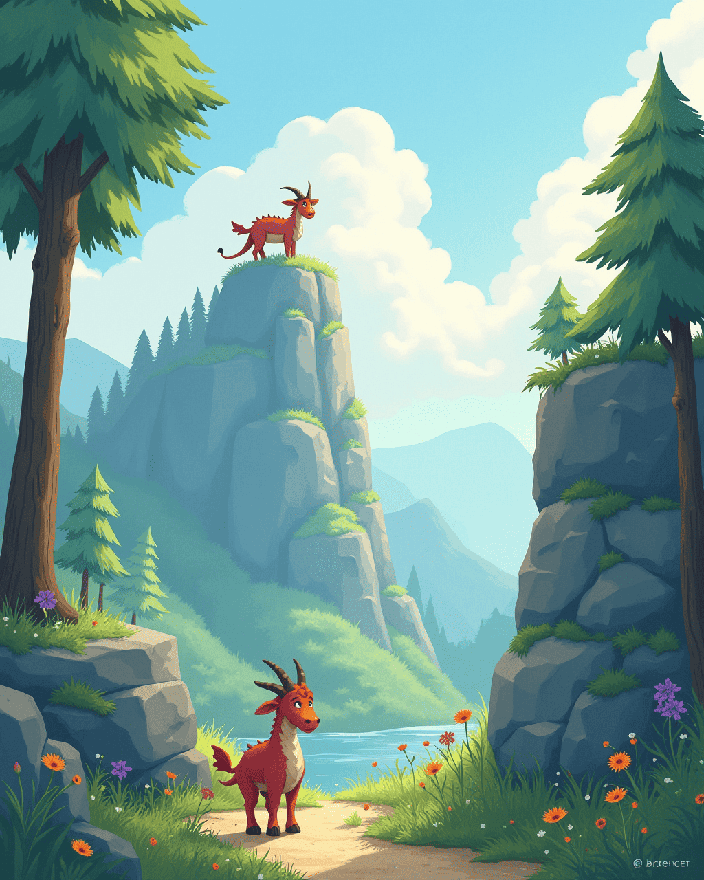 After the river, the friends climbed the steep Misty Mountain. The path was slippery, and Milo’s hooves slipped, but his courage never wavered. At the peak, a fierce dragon perched, breathing a warm glow over the valley below. Milo approached, lowered his head, and bowed respectfully, saying, “I may be a goat, but I honor the dragon’s spirit.” The dragon, surprised, gave Milo a gentle nod, welcoming him into the world of adventure.