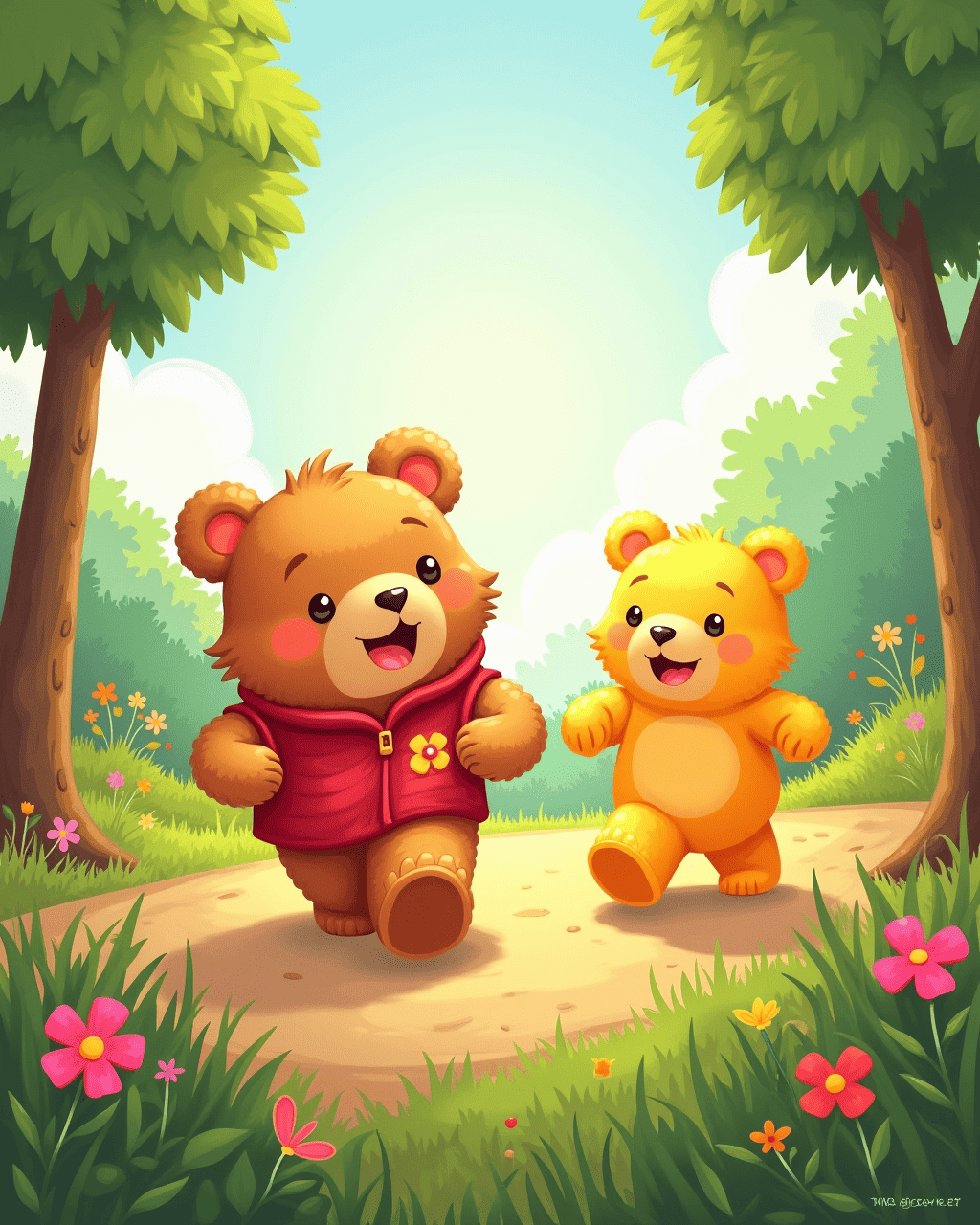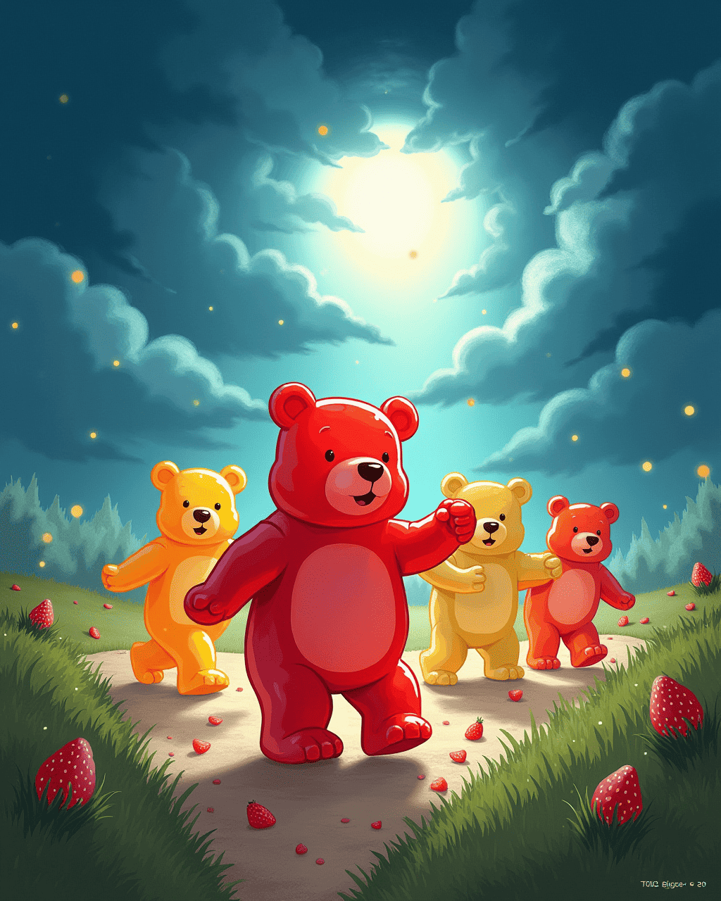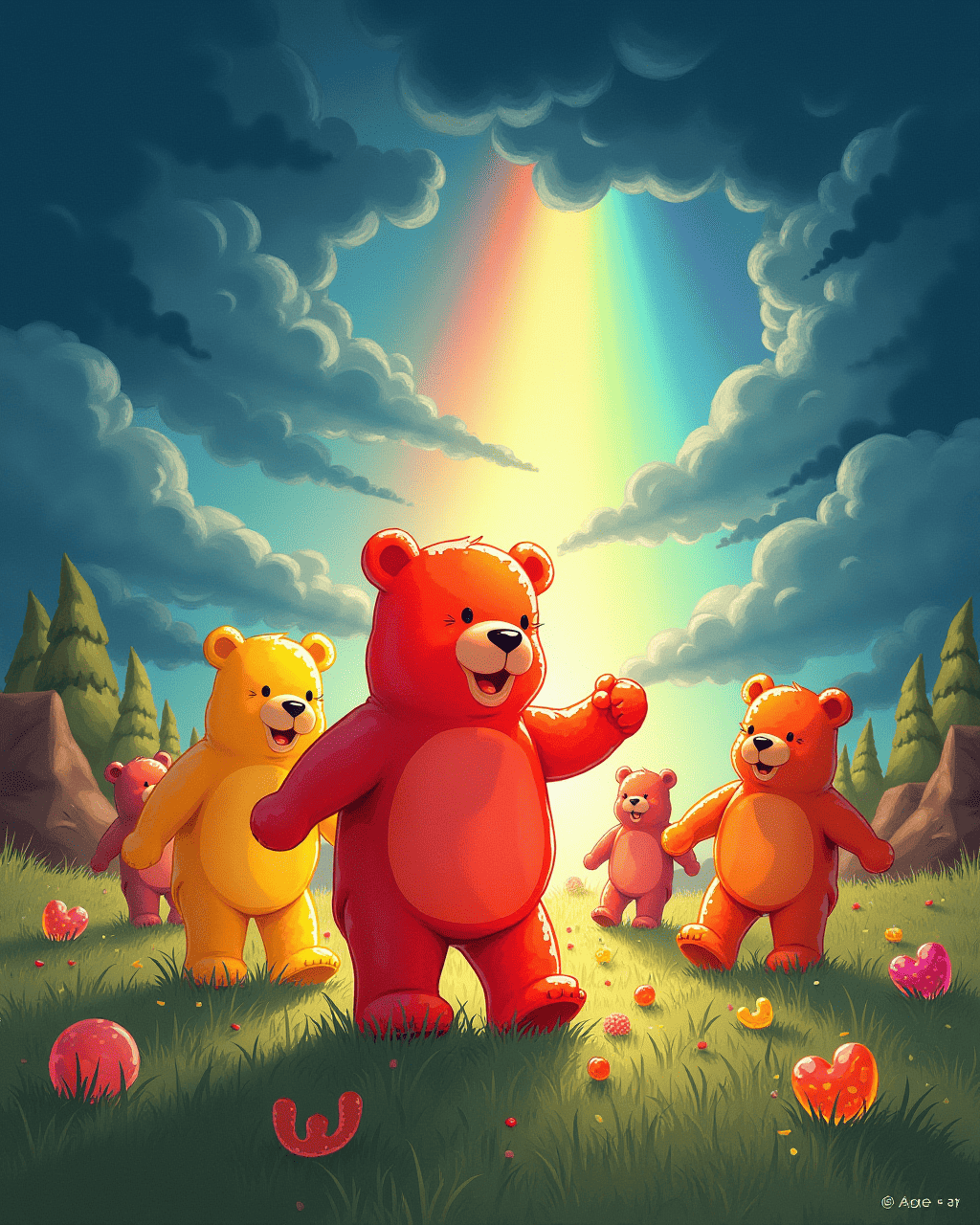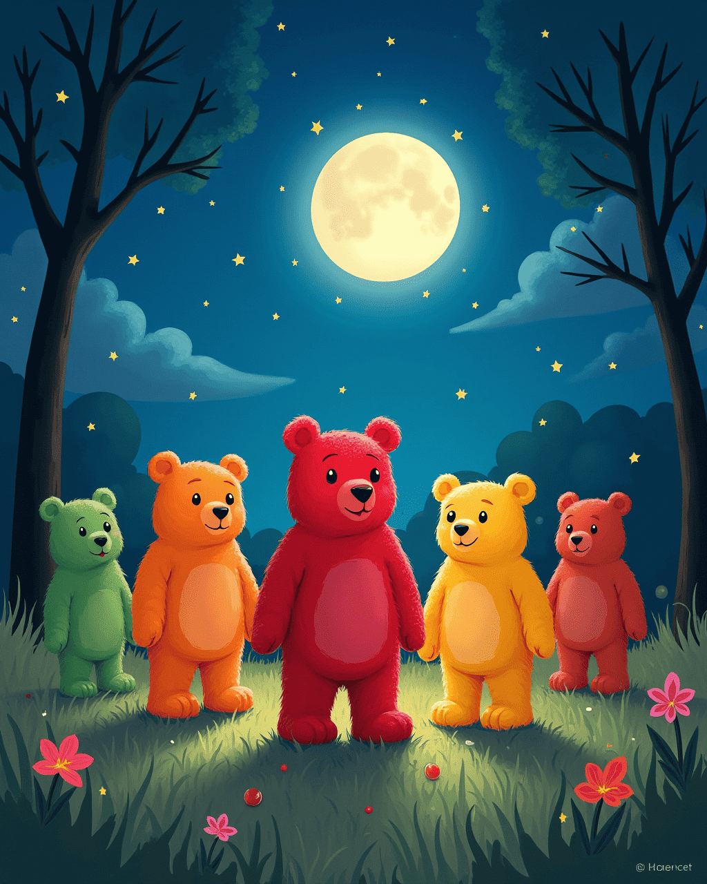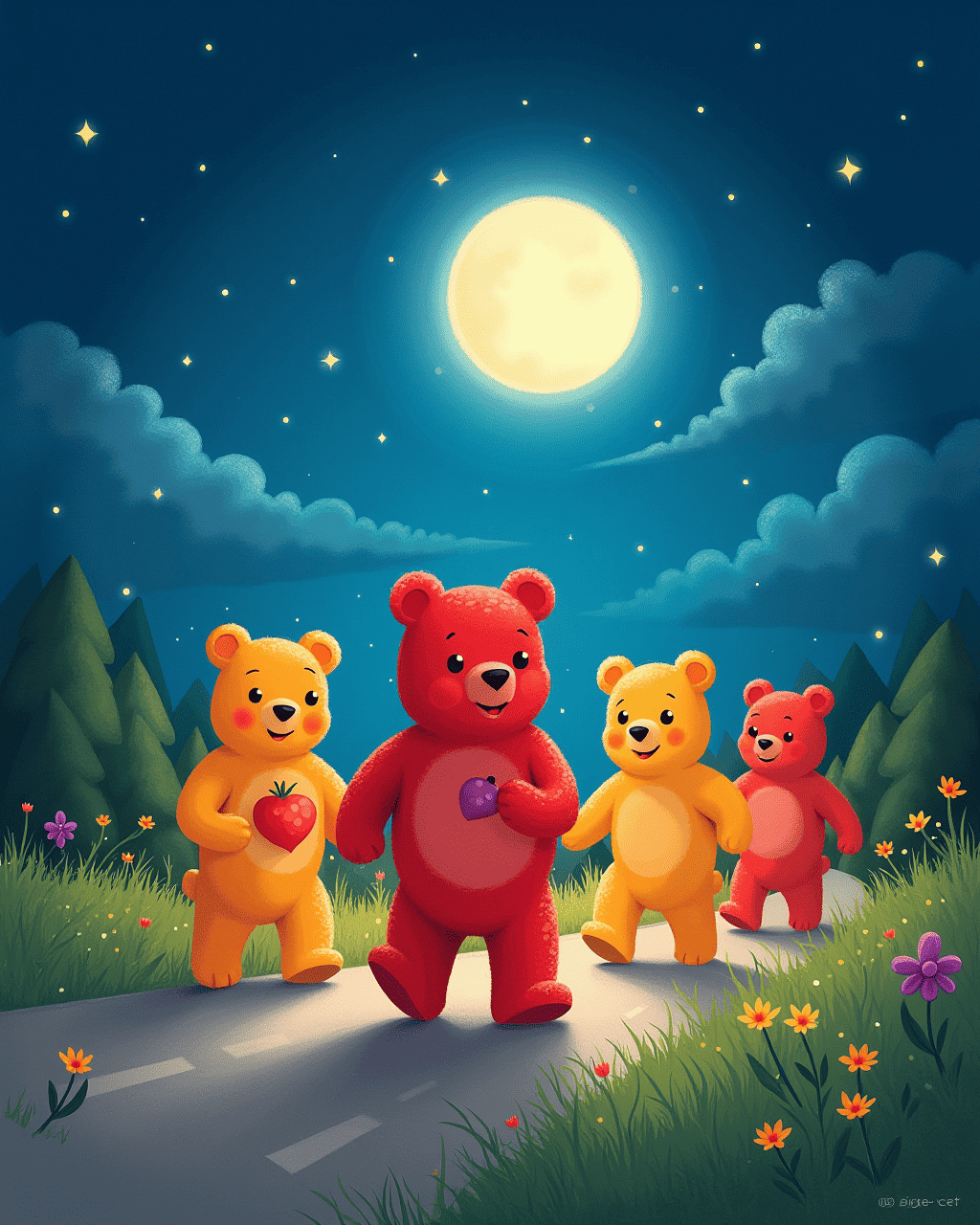 After the race, the bears held a picnic with jellybean pizza and lemonade. They sang songs about friendship and adventure. The mayor announced a new tradition: the Annual Gummy Bear Race. All the kids and bears promised to meet again next year. The town celebrated as the sun set over a rainbow of sweet treats.