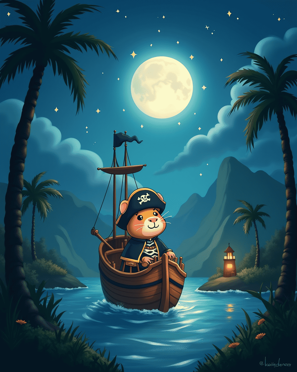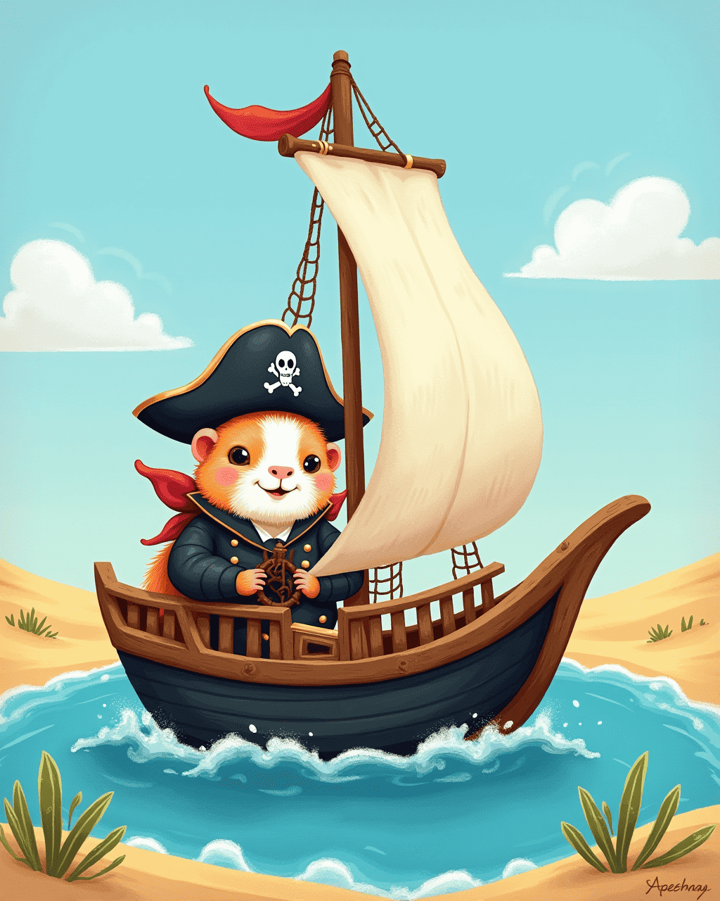 With the map in paw, Gilly and his friends built a small sailboat called the Black Pearl. Gilly became the captain, steering the hull with a tiny wooden hat. Pip flew the sails while Tully kept the compass steady. Together they set sail beyond the golden dunes, chasing the horizon. They sang pirate songs and imagined distant lands.
