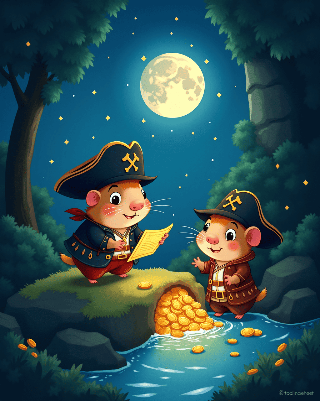 On a mossy rock, Gilly read the final clue of the map. It told of a hidden tunnel beneath the waterfall. Tully nudged the stone, revealing a secret passage carved deep into the earth. Their lanterns flickered through the darkness, guiding them on. Inside, they found piles of golden coins and sparkling jewels, but the biggest treasure was something unexpected.