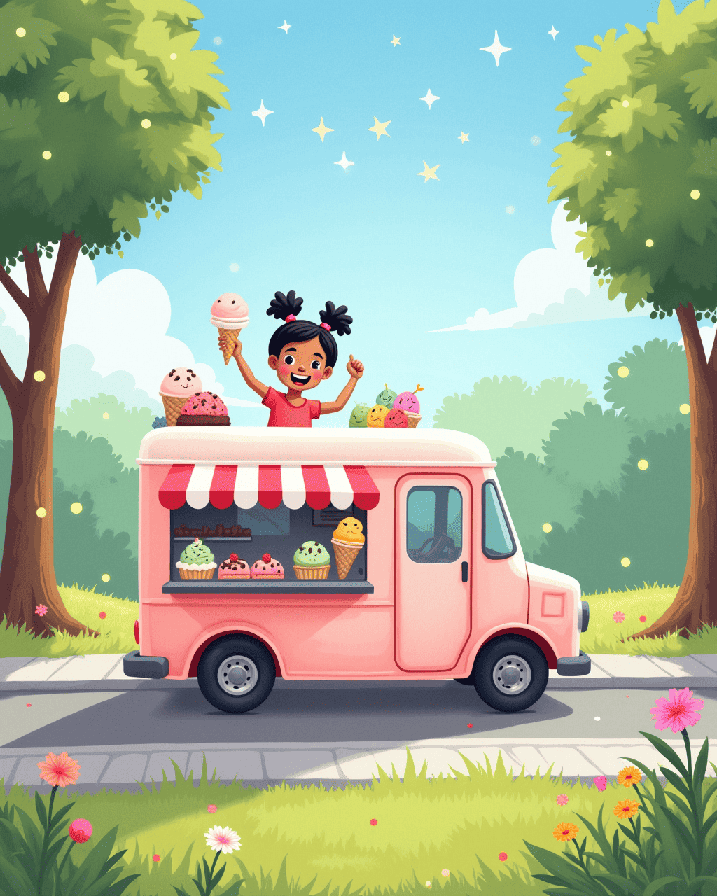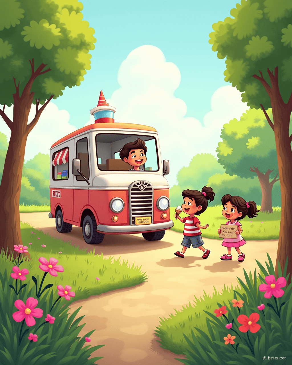 Lily woke up to the sound of a cheerful melody drifting through her window. She pulled on her shoes and followed the music down the street. The notes seemed to lead her to the park, where a crowd of children was gathered around a bright, shiny truck. The truck’s owner, Mr. Patel, was holding a sign that read, “Free ice cream for the bravest of hearts.” Lily felt her heart beat faster as she stepped inside.