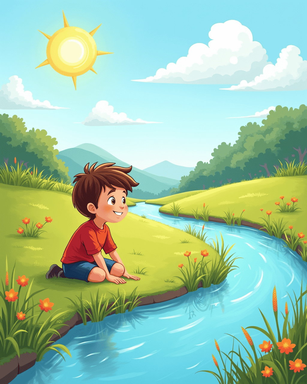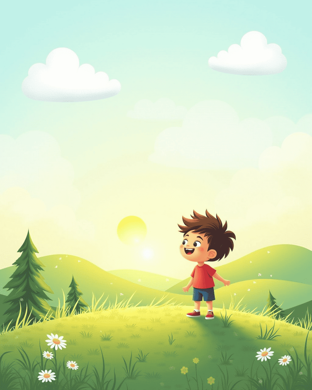 When the sun peeks over the hills, Milo wakes up with a bright smile. He looks out his window and feels the warm breeze stir his hair. Milo thinks the clouds might be ready for a fun game today. He decides to walk to the hilltop to talk to the clouds. On the hill, the clouds listen carefully as Milo explains his day.