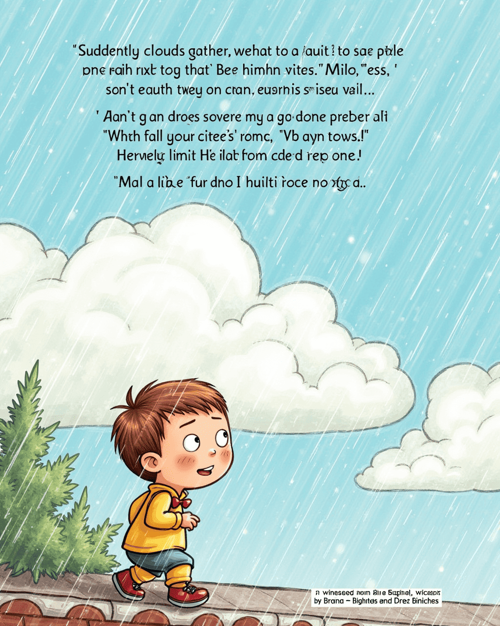 Suddenly clouds gather, and rain taps on the roof like tiny drumbeats. Milo counts drops; each one seems to answer him. He whispers, "Where do you come from?" The raindrops respond, "We fall from cloud kisses." Milo feels warm even though it’s raining.