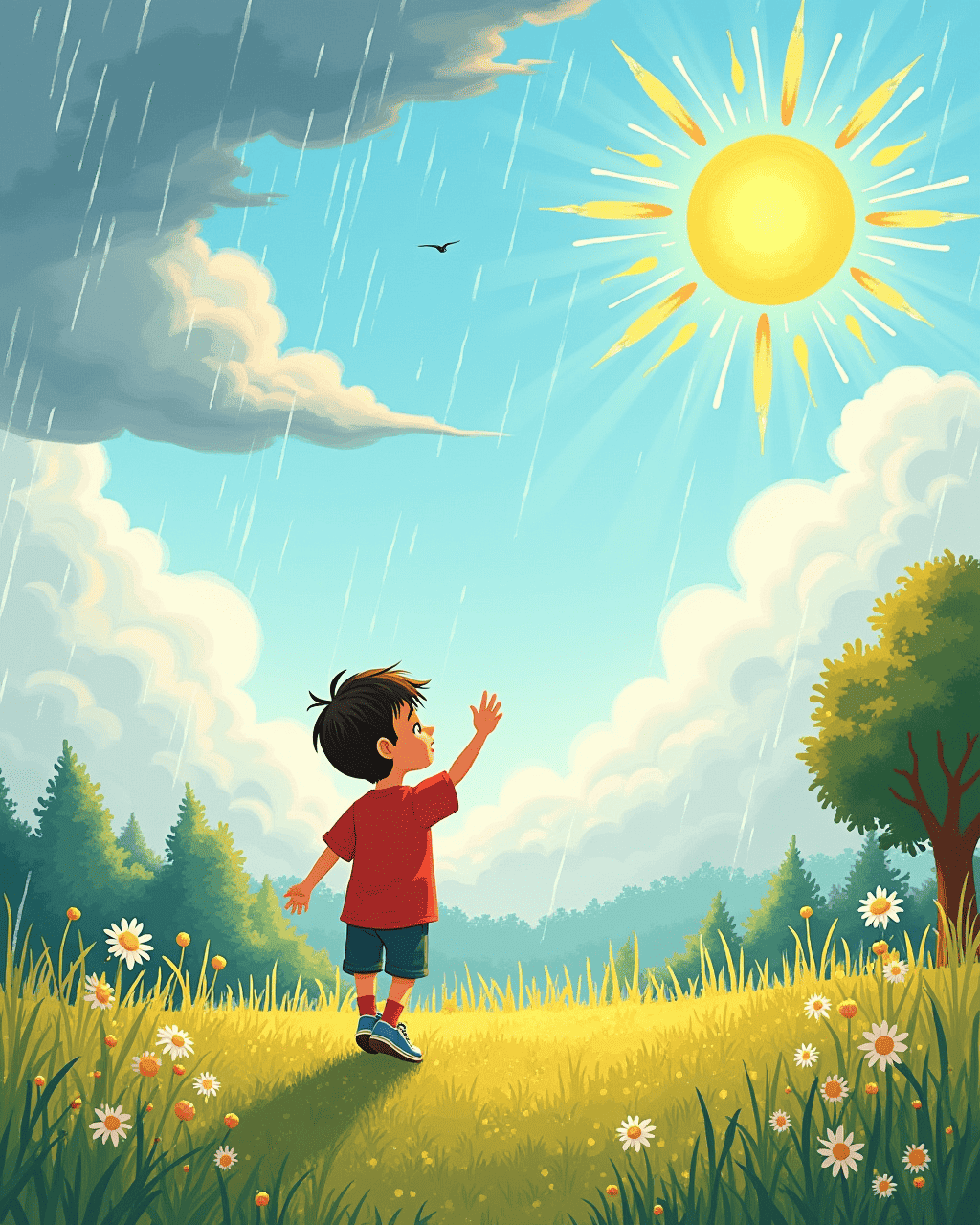 After the rain, the sun peeks again, painting golden clouds. Milo waves goodbye to the wind, clouds, and rain. He says, "Thank you for the stories." The wind answers, "See you tomorrow!" Milo walks home, dreaming about tomorrow’s adventure.