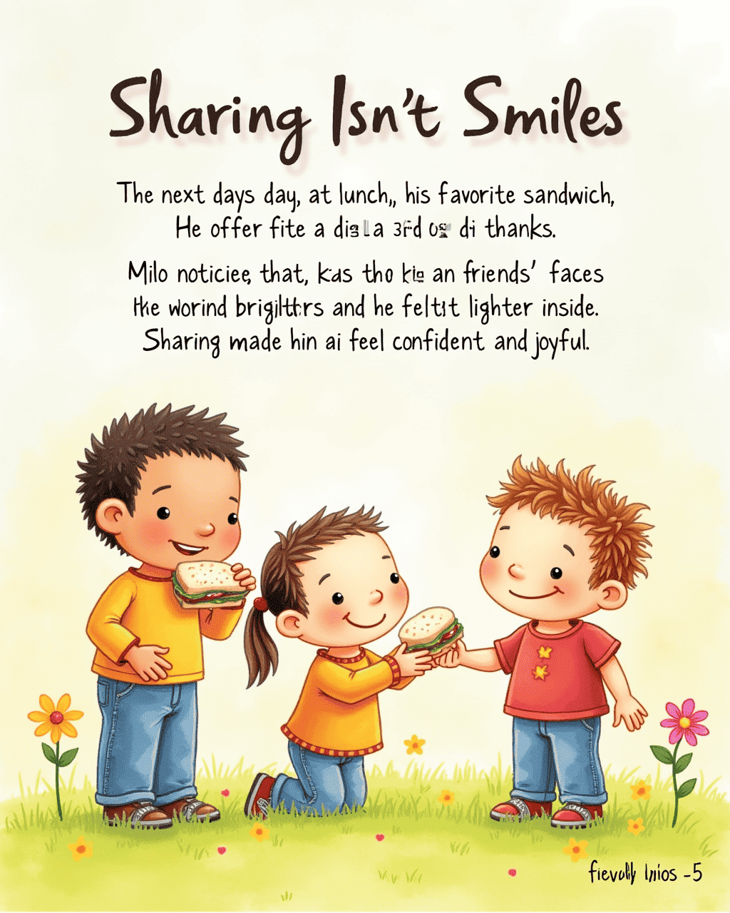The next day at lunch, Milo brought his favorite sandwich. He offered a bite to Lily and a third child. Everyone laughed and said thanks. Milo noticed that his friends’ faces brightened, and he felt lighter inside. Sharing made him feel confident and joyful.