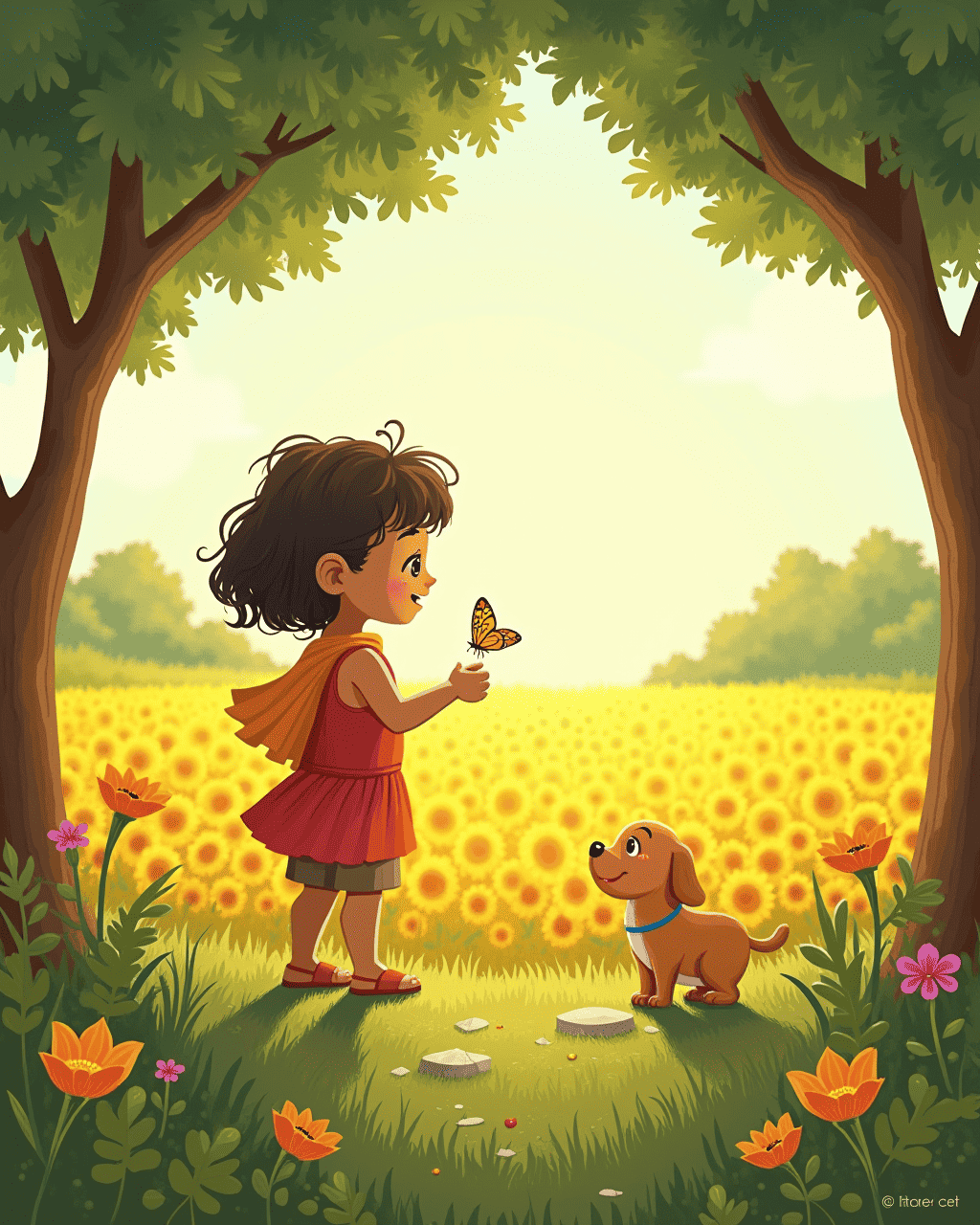Milo loved to chase butterflies in the sunflower fields near his village. One sunny morning, he found a stone that hummed when he touched it. The old storyteller, Master Yara, noticed his fascination. She invited Milo to sit beside her under the banyan tree. Milo asked about the humming stone, eager to learn its secret.