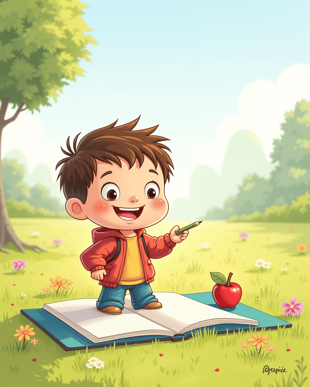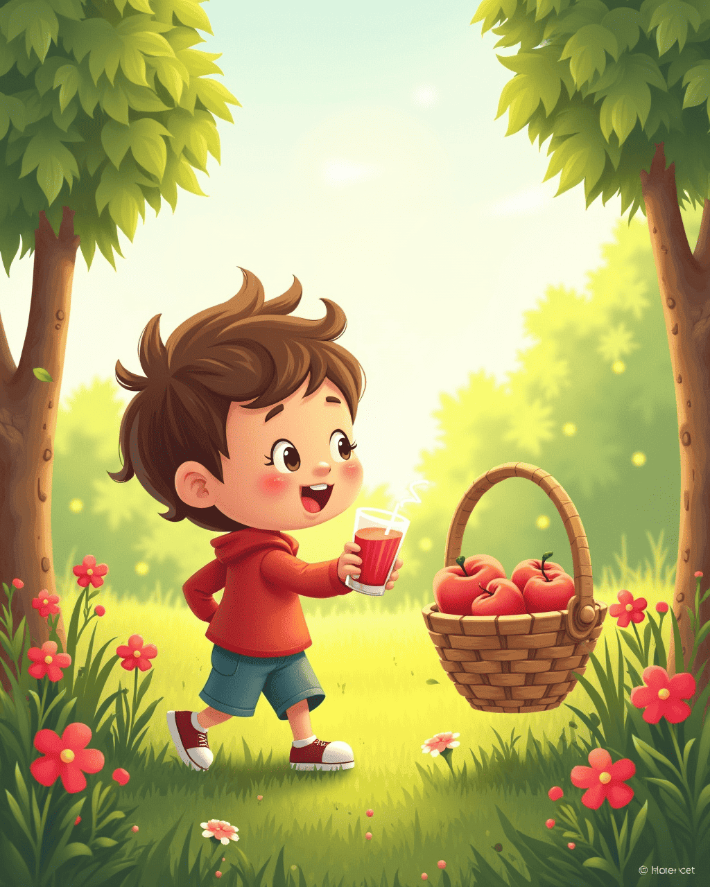 While Milo was playing, a gentle voice called out from the garden. It was his grandma, holding a basket of fresh apples. She asked, "Would you like to learn how to make a fruit smoothie?" Milo answered eagerly. She explained that she would show him how to slice the apples safely and blend them. Milo remembered his homework and felt the need to finish it before the next visit.